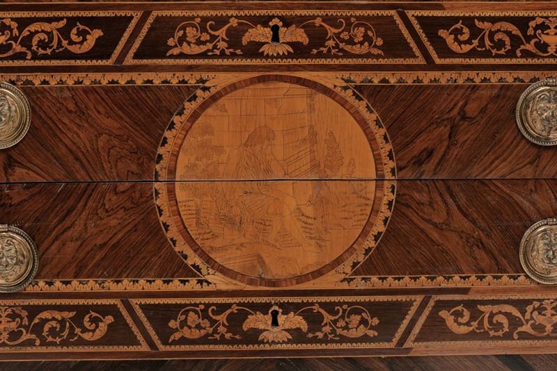 Interamente decorati a volute fogliacee e vasi entro riserve, due cassetti a specchio centrati da medaglione circolare con raffigurazioni di personaggi maschile e femminile, un altro cassetto sotto al piano in marmo verde antico. gambe troncopiramidali, cm 132x60x93