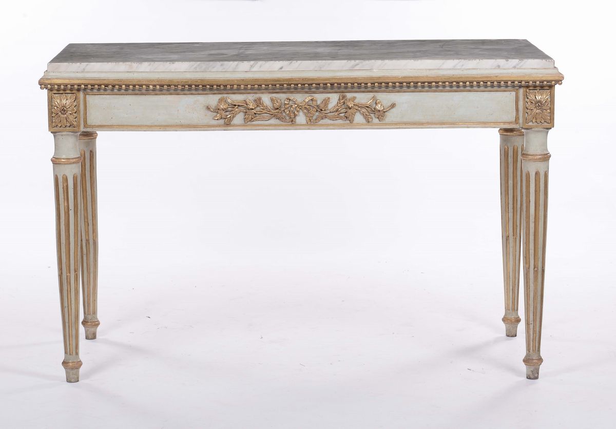 fascia decorata da intaglio vegetale centrato da fiocco, gambe troncoconiche scanalate, piano in marmo bianco, cm 145x68x92