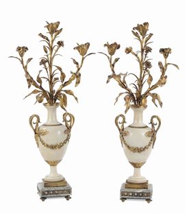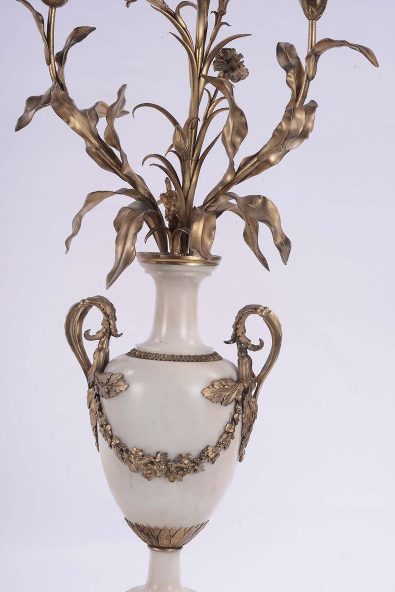 Coppia di vasi in marmo con candelabri in bronzo dorato, Francia XVIII-XIX secolo