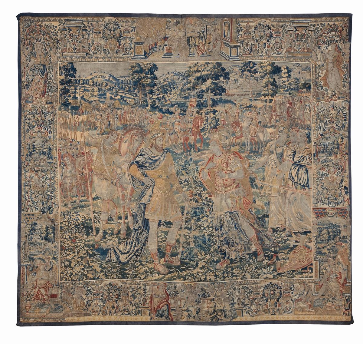 raffigurante l’incontro di Alessandro il Grande con la regina delle Amazzoni. Bordura a grottesche, edifici, figure allegoriche e bibliche, cm 334x350