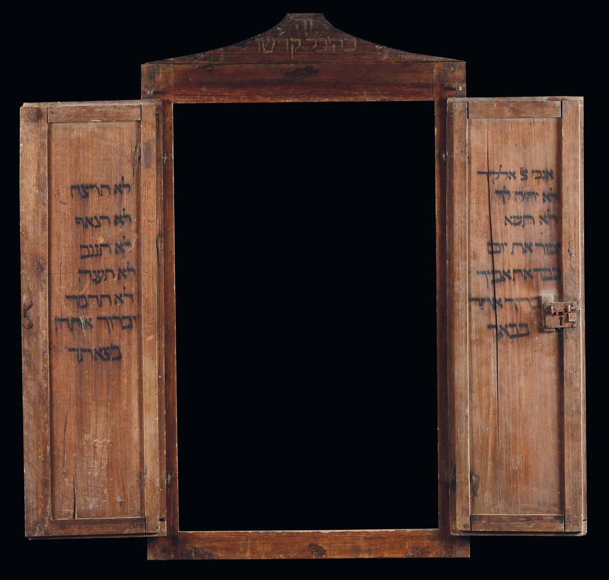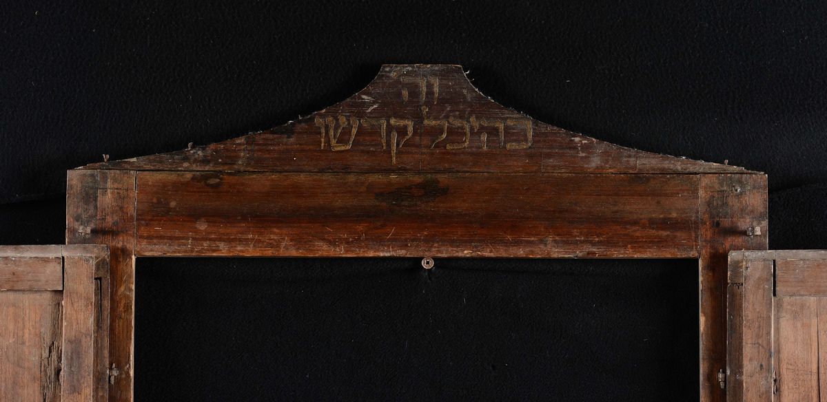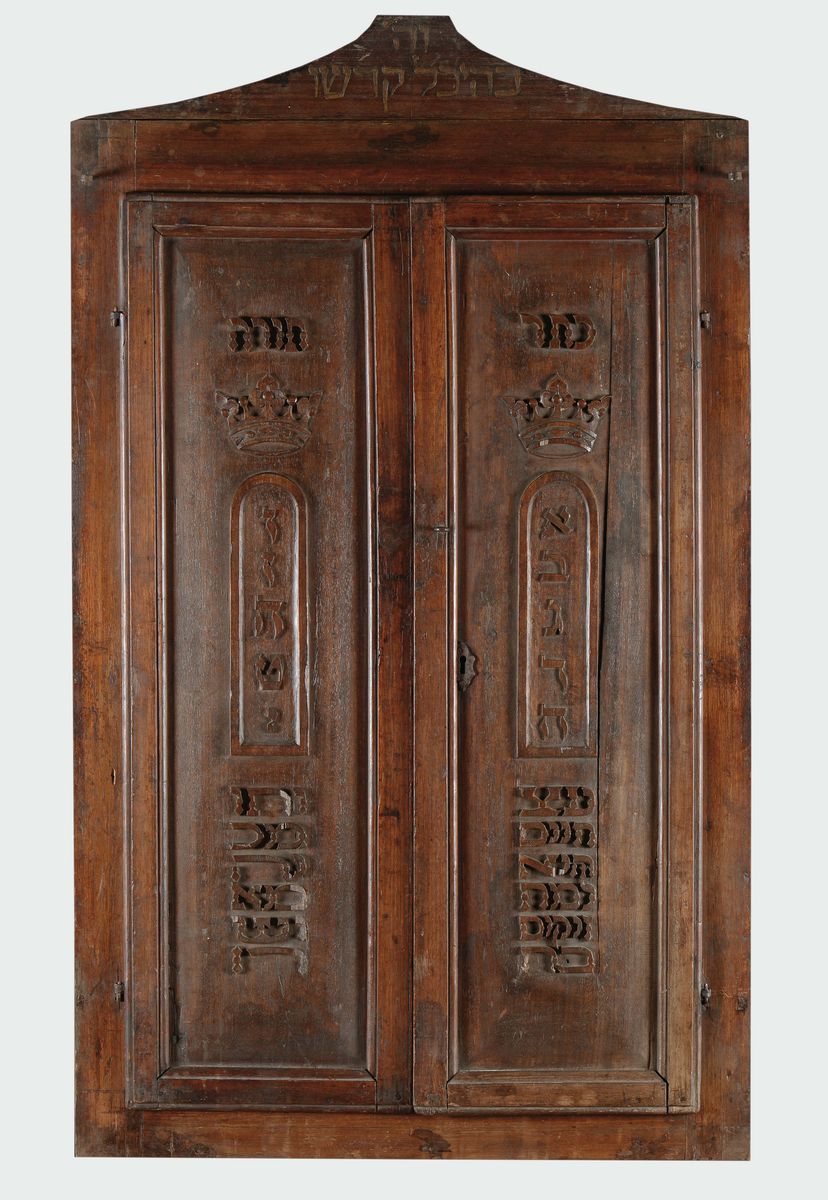 Frontale di stipo in noce con due sportelli scolpiti con raffigurazione delle tavole di Mosè, della corona della Torah e di salmi delle antiche scritture. L’opera di intaglio è stata eseguita, probabilmente, da un intagliatore che non conosceva la scrittura ebraica viste le incongruenze grammaticali. All’interno le scritte ad inchiostro dei dieci comandamenti correttamente articolate
