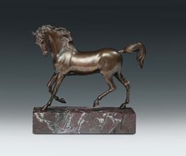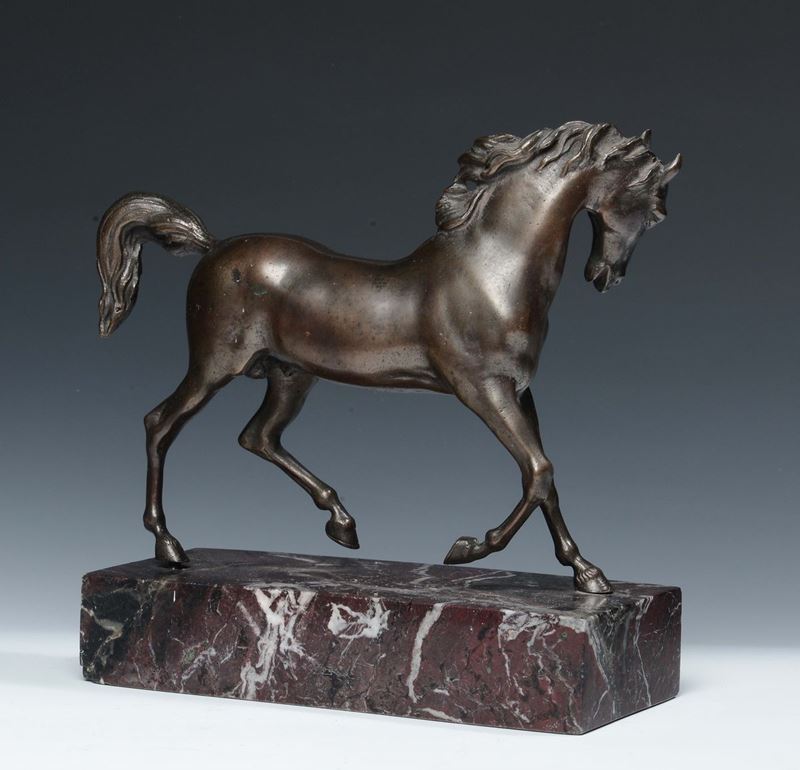 Cavallo in bronzo fuso e cesellato su base in marmo, probabile XIX secolo