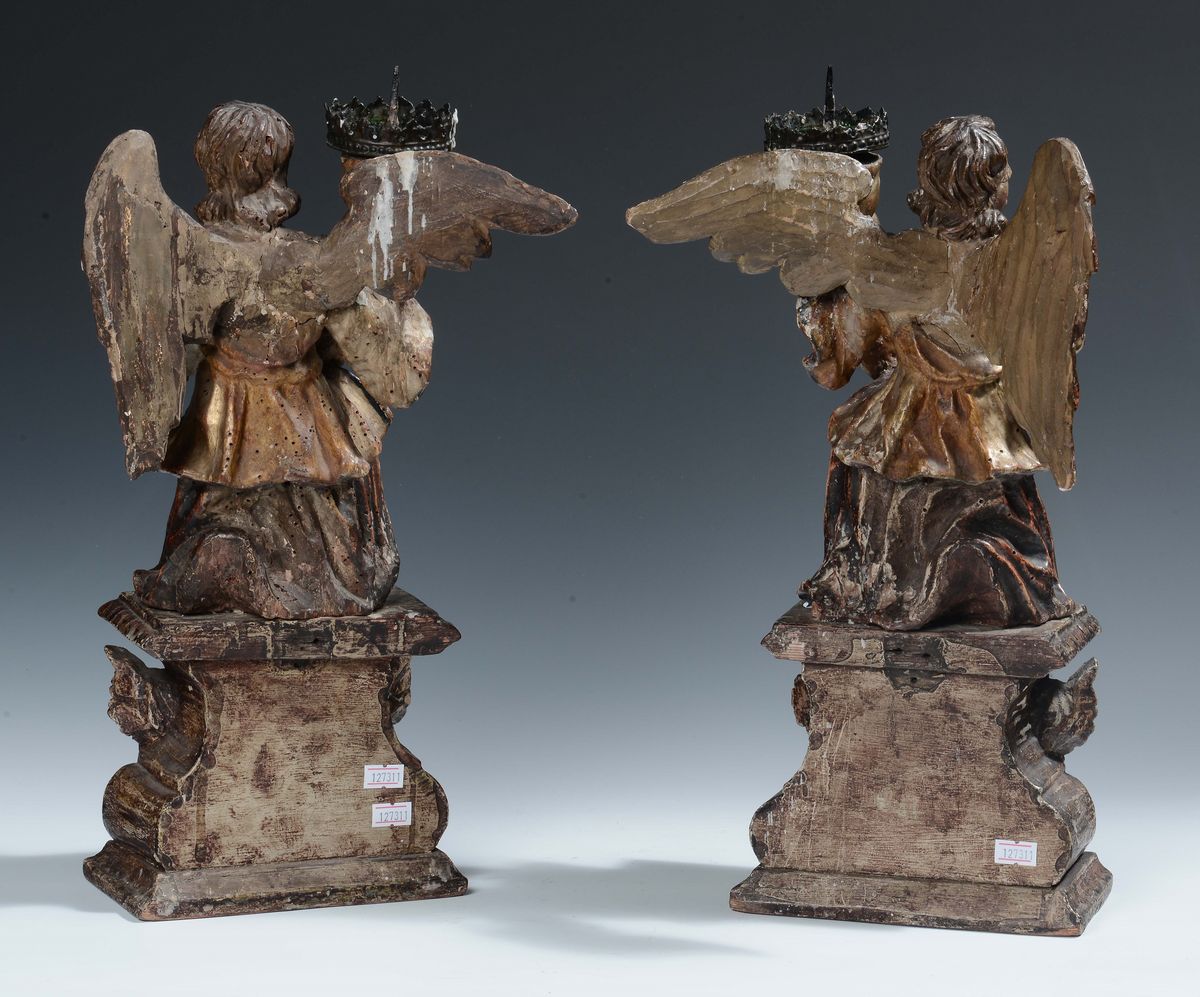Coppia di angeli genuflessi portacero in legno intagliato, dipinto e dorato, arte italiana del XVII secolo