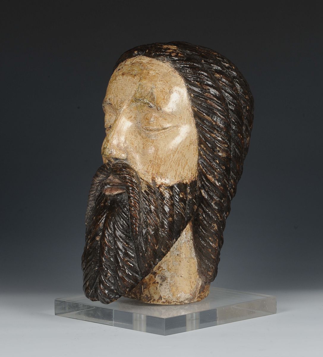 La testa del Cristo, frammento derivante da una crocifissione o da un compianto, dai capelli e dalla barba schematizzati in una resa quasi geometrica, riprende i modelli esecutivi cari alla bottega De Donati, scultori lombardi che influenzarono la produzione artistica del nord Italia tra XV e XVI secolo. Cfr: “La Scultura Lignea Lombarda del Rinascimento”, Raffaele Casciaro, ed. Skira, Milano 2000. “Scultura Lignea della diocesi di Novara tra ‘400 e ‘500”, Angela Guglielmetti, Novara 2000.