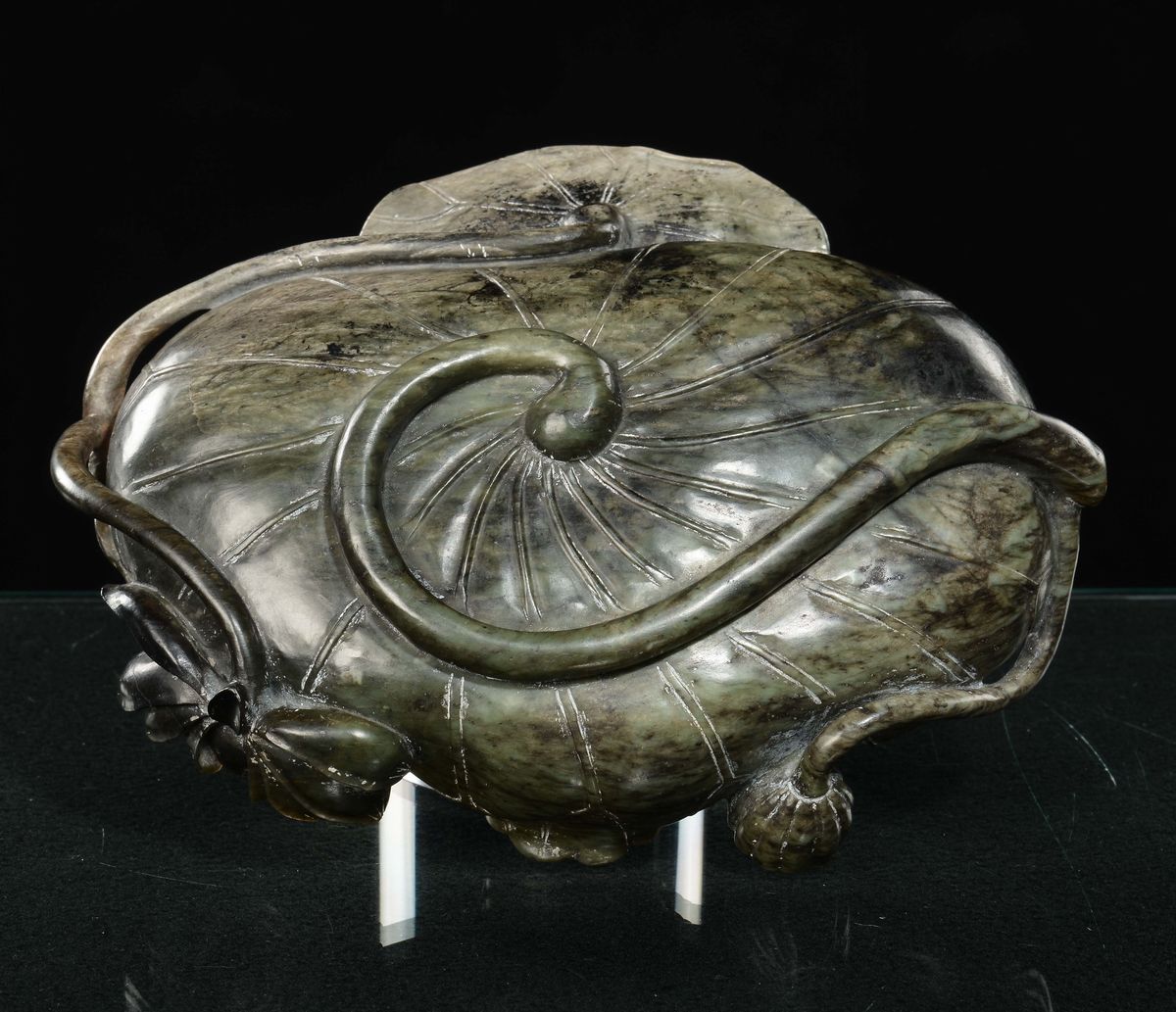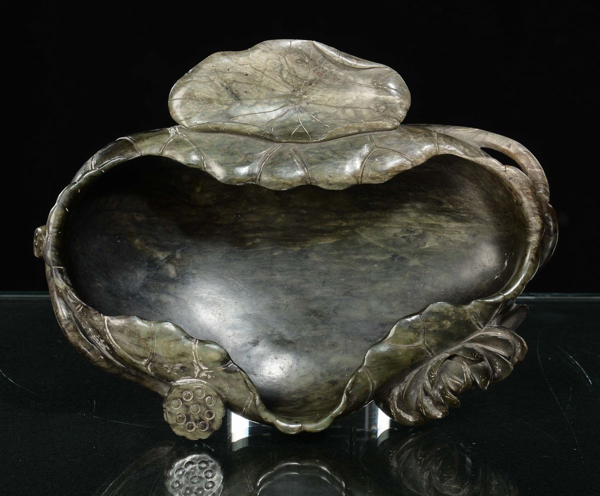 Ciotola in giada spinacio a forma di fiore di loto, Cina, Dinastia Qing, XIX secolo