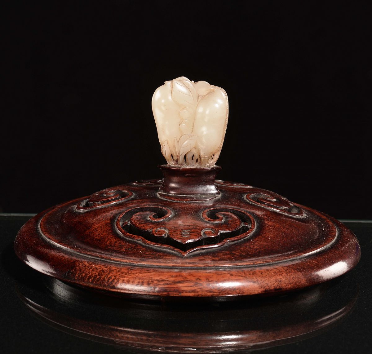 Coperchio in legno di Huangali sormontato da giada bianca a forma di frutto, Cina, Dinastia Qing, XIX secolo
