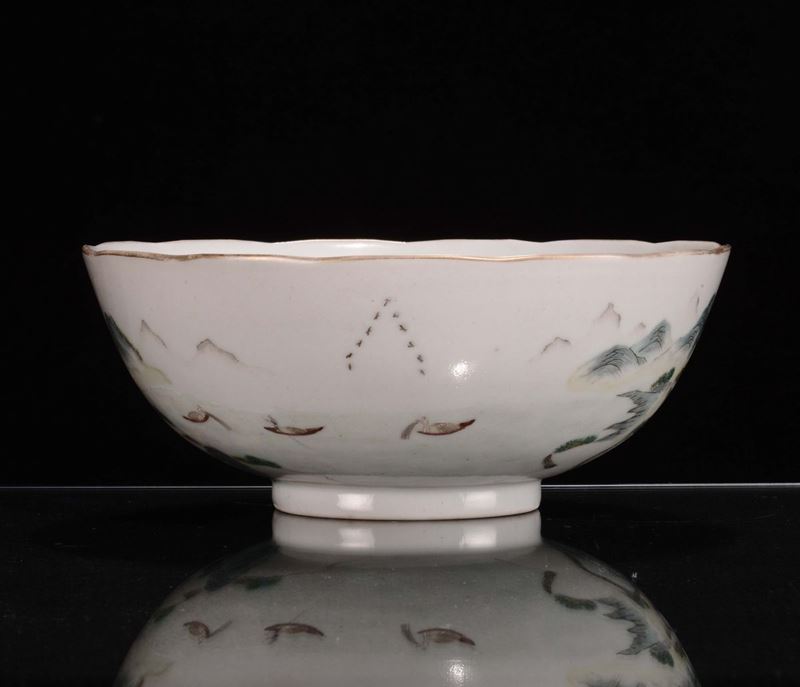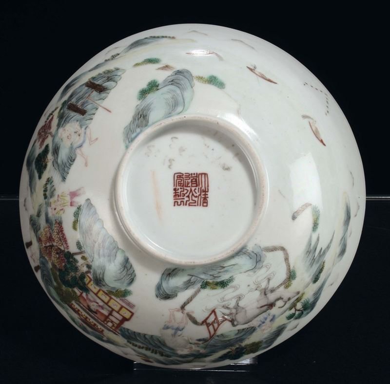 Coppa in porcellana a smalti policromi con paesaggio e figure, Cina, Dinastia Qing, marca e del periodo Daoguang (1821-18 [..]