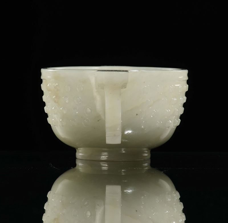 Coppetta cerimoniale a due manici in giada bianca a decoro arcaico, Cina, Dinastia Qing, XIX secolo