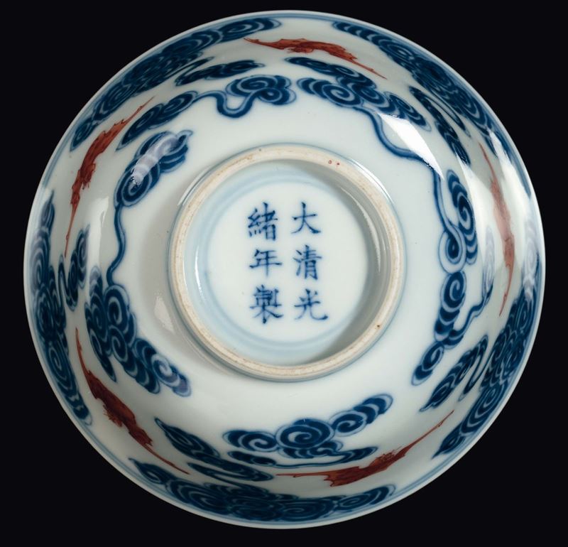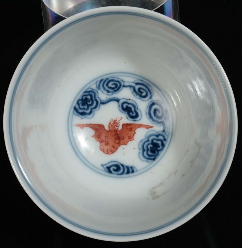 Coppetta in porcellana policroma con raffigurazione di pipistrelli, Cina, XX secolo