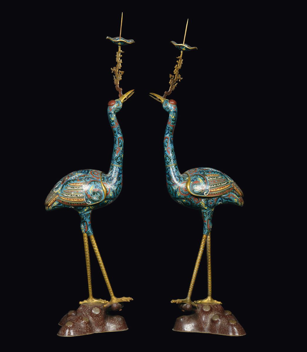 Coppia di grandi cicogne in metallo e smalti cloisonnè, Cina, Dinastia Qing, XIX secolo