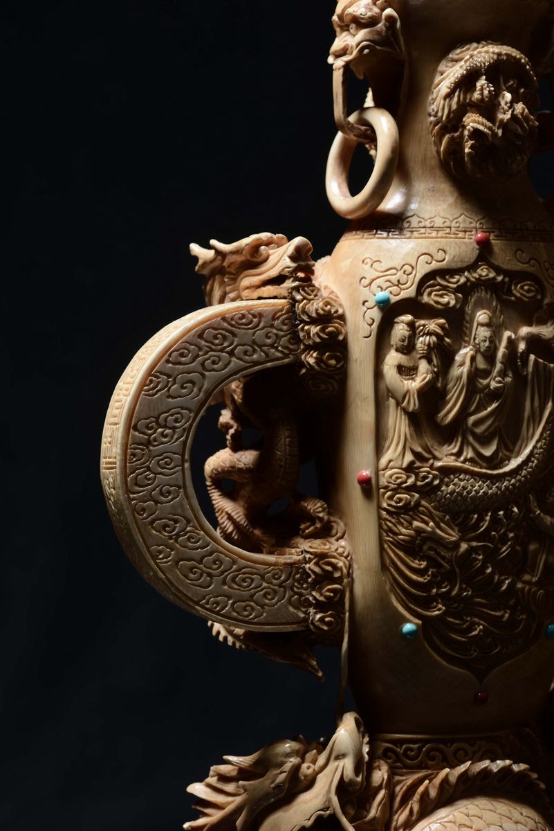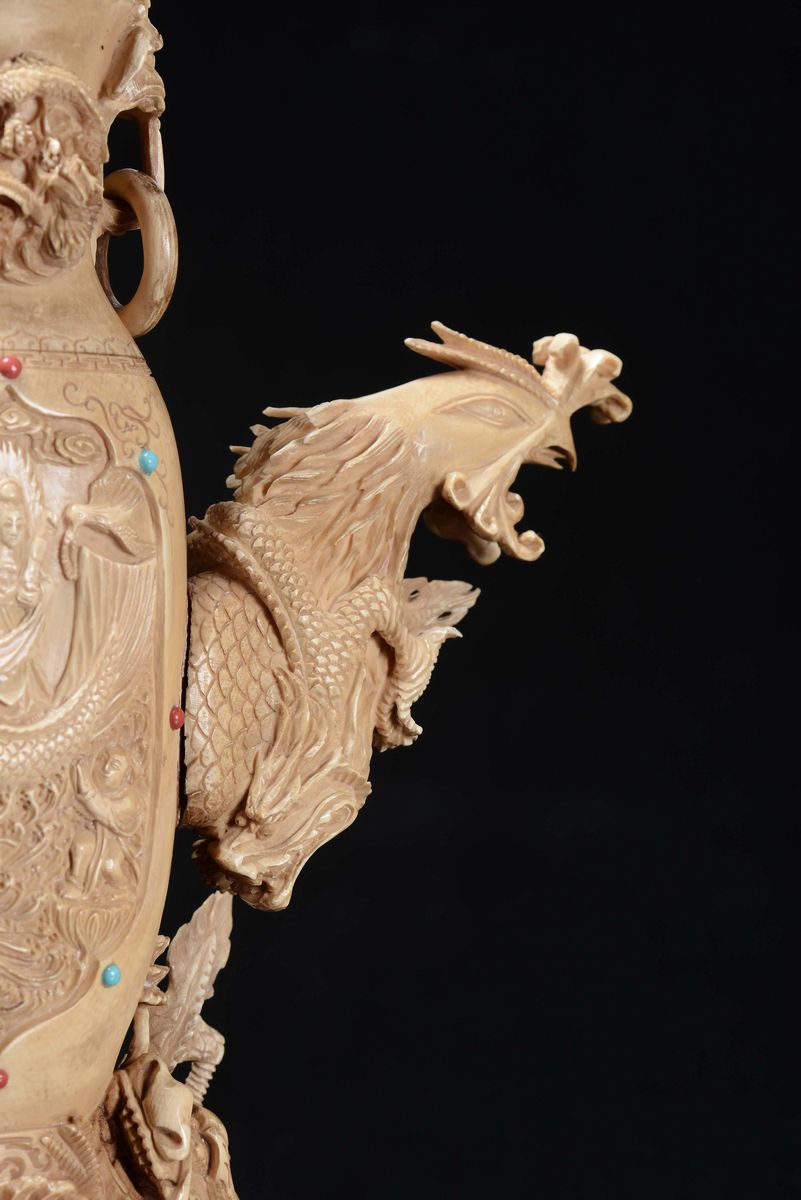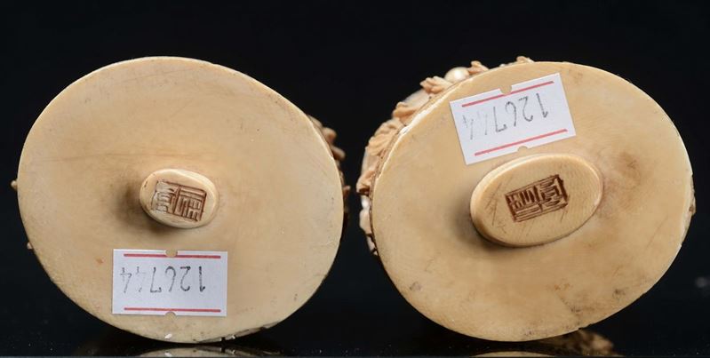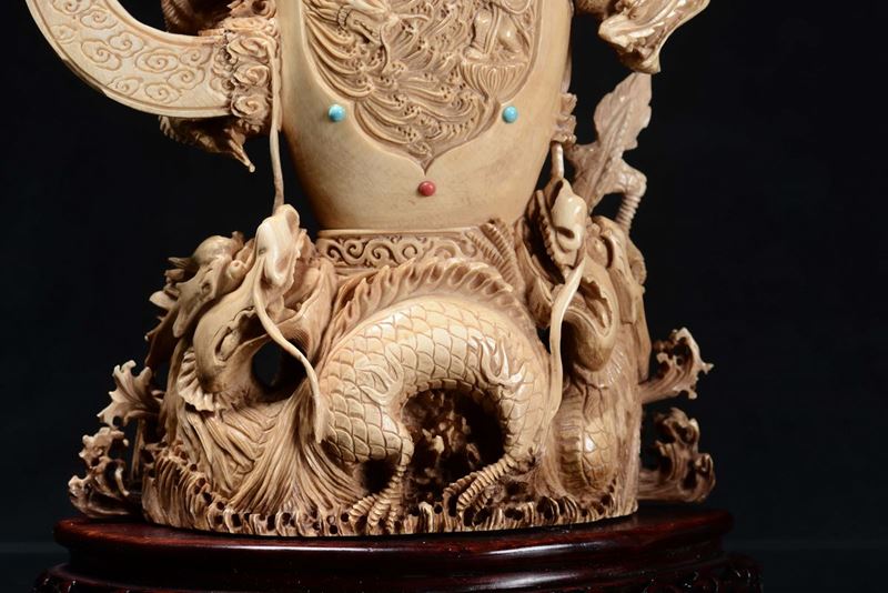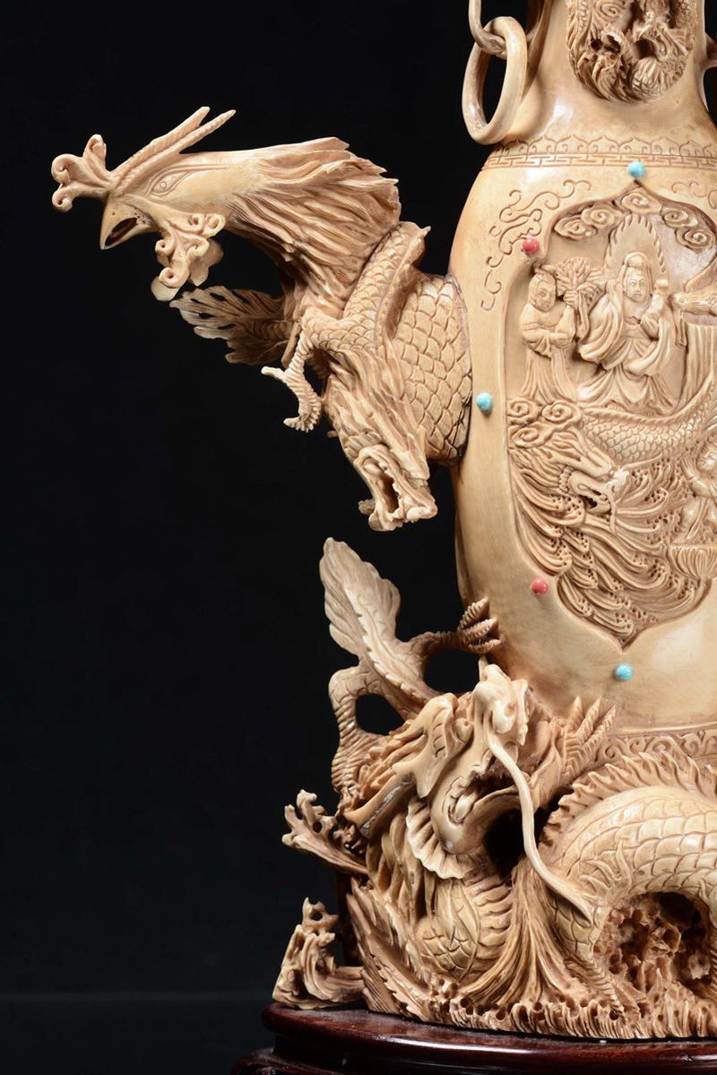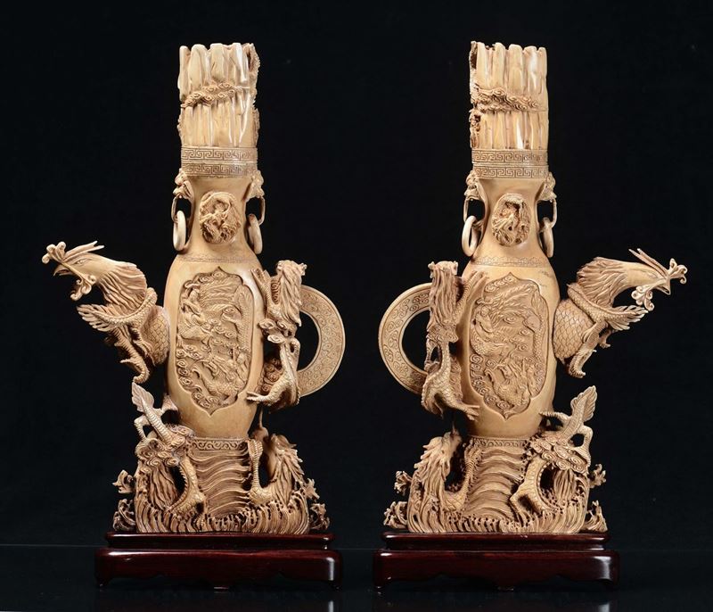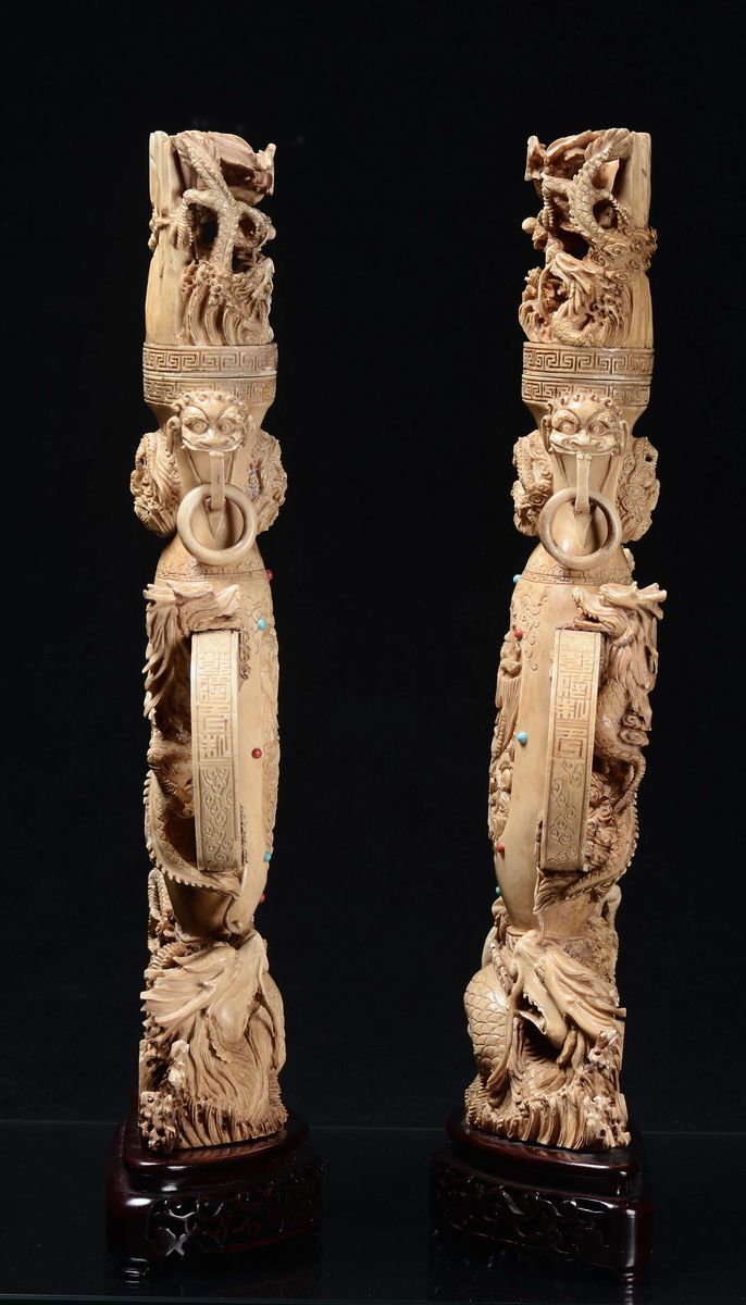 Coppia di sculture in avorio scolpito su base in legno con animali in rilievo, Cina, Dinastia Qing, fine XIX secolo