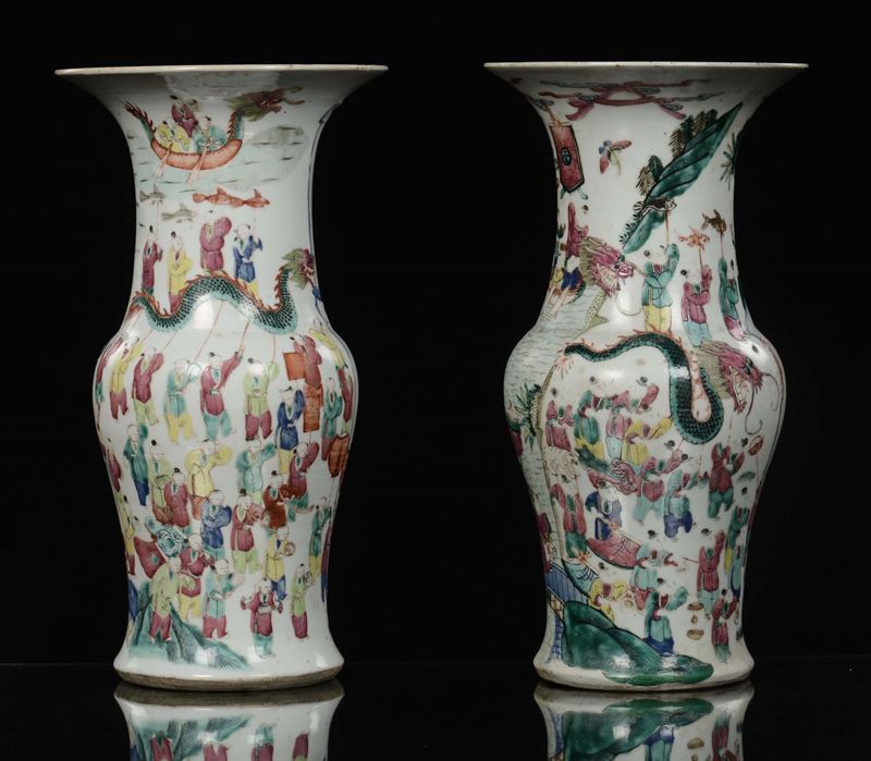 Coppia di vasi a tromba in porcellana Famiglia Rosa con scene di vita di corte, Cina, Dinastia Qing, XIX secolo