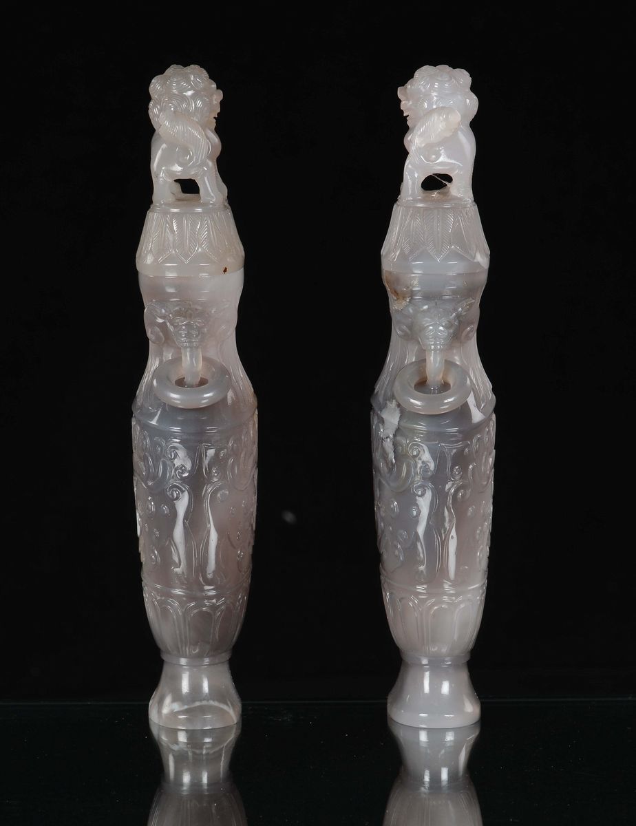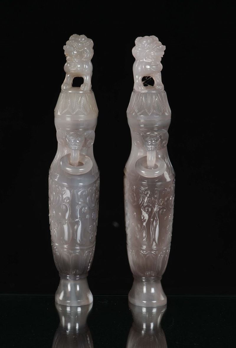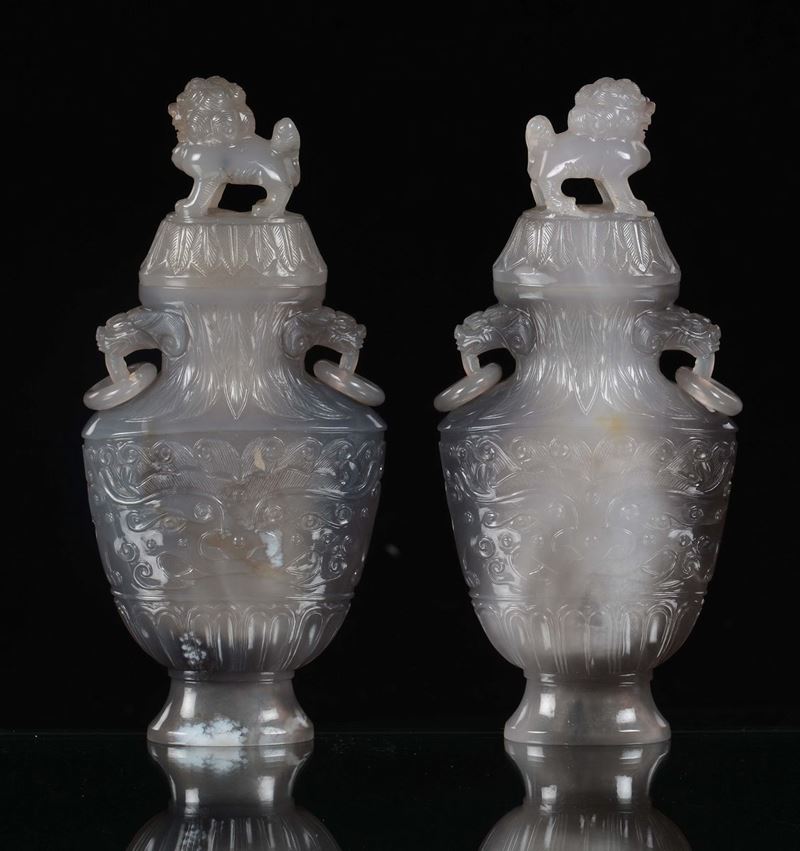 Coppia di vasi in agata con coperchi sormontati da figure di cani di Pho, Cina, Dinastia Qing, XIX secolo