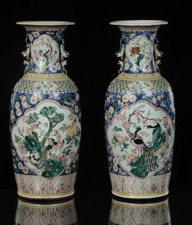 Coppia di vasi in porcellana Famiglia Verde con pavoni entro riserve, Cina, Dinastia Qing, XIX secolo