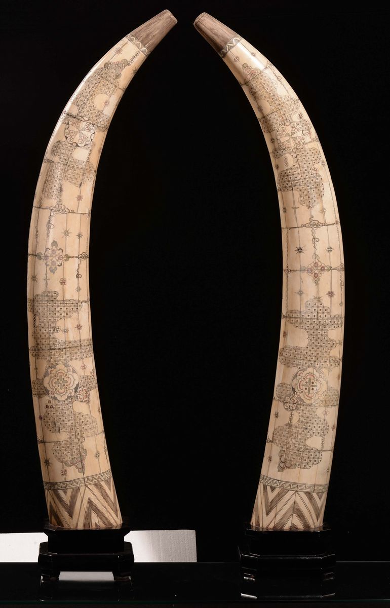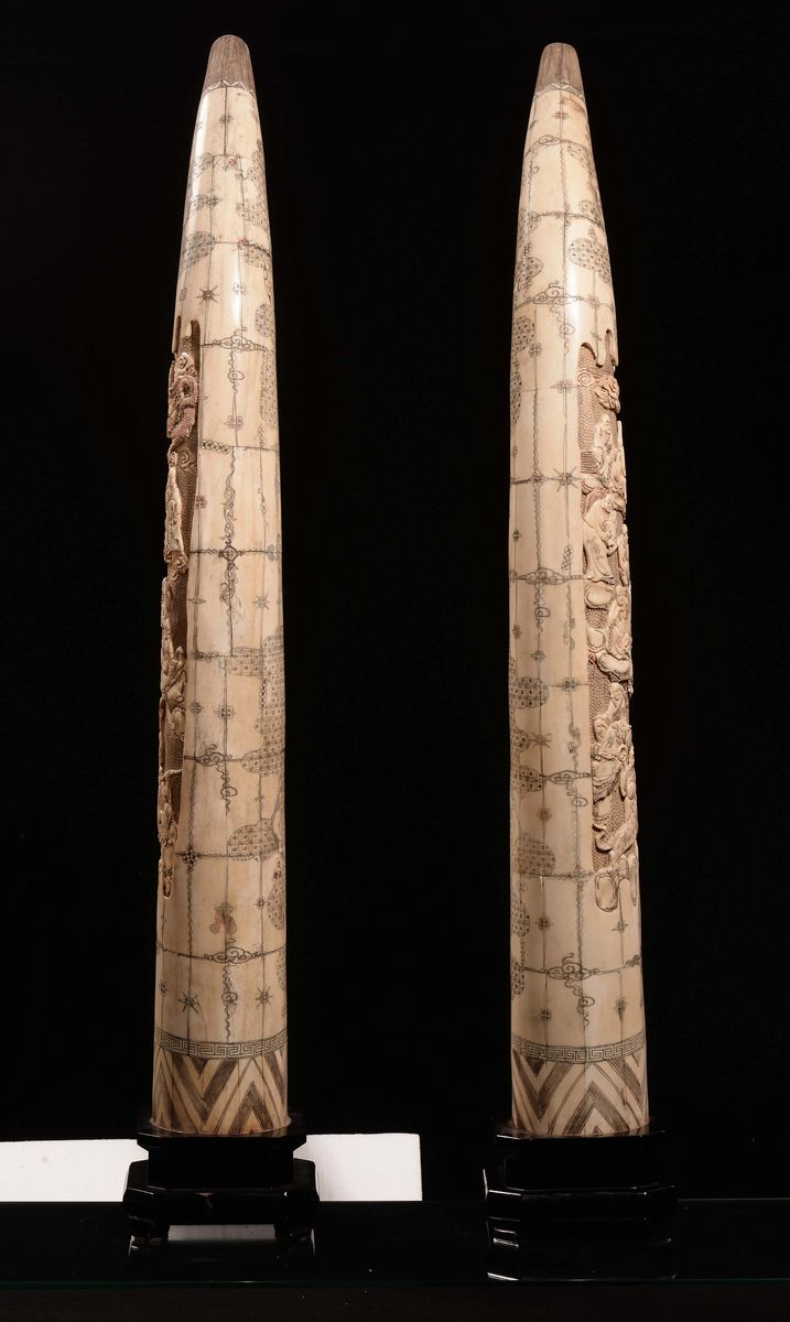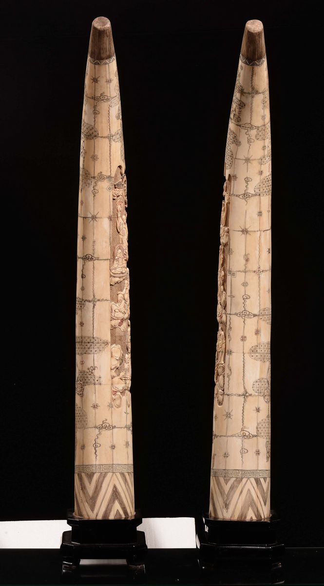 Due zanne in osso e avorio scolpito con personaggi e draghi, Cina, Dinastia Qing, inizio XIX secolo
