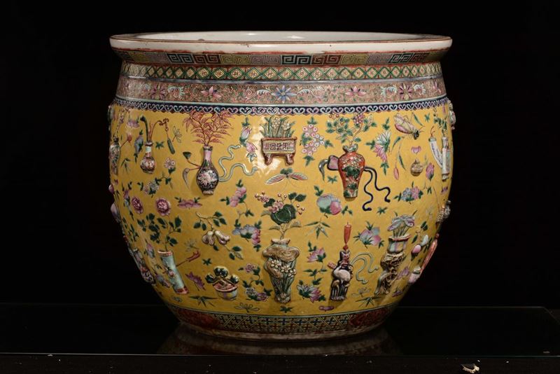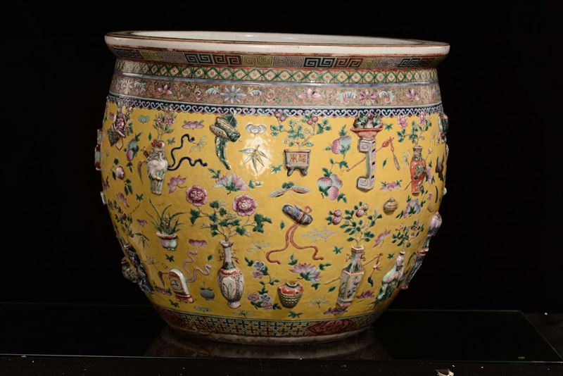 Grande ed importante vasca da pesci in porcellana a fondo giallo con elementi a rilievo, Cina, Dinastia Qing, epoca Daoguang [..]