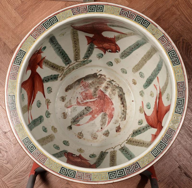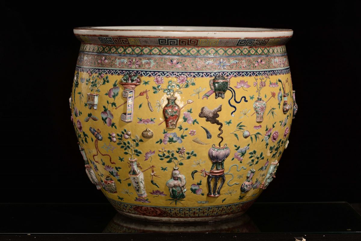 Grande ed importante vasca da pesci in porcellana a fondo giallo con elementi a rilievo, Cina, Dinastia Qing, epoca Daoguang (1821-1850)