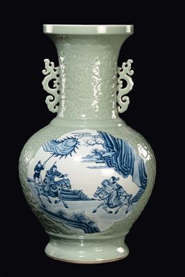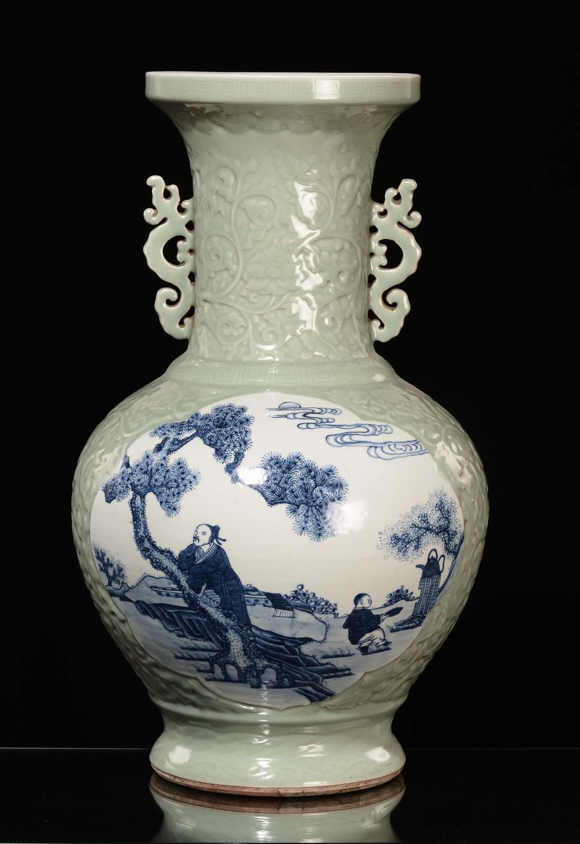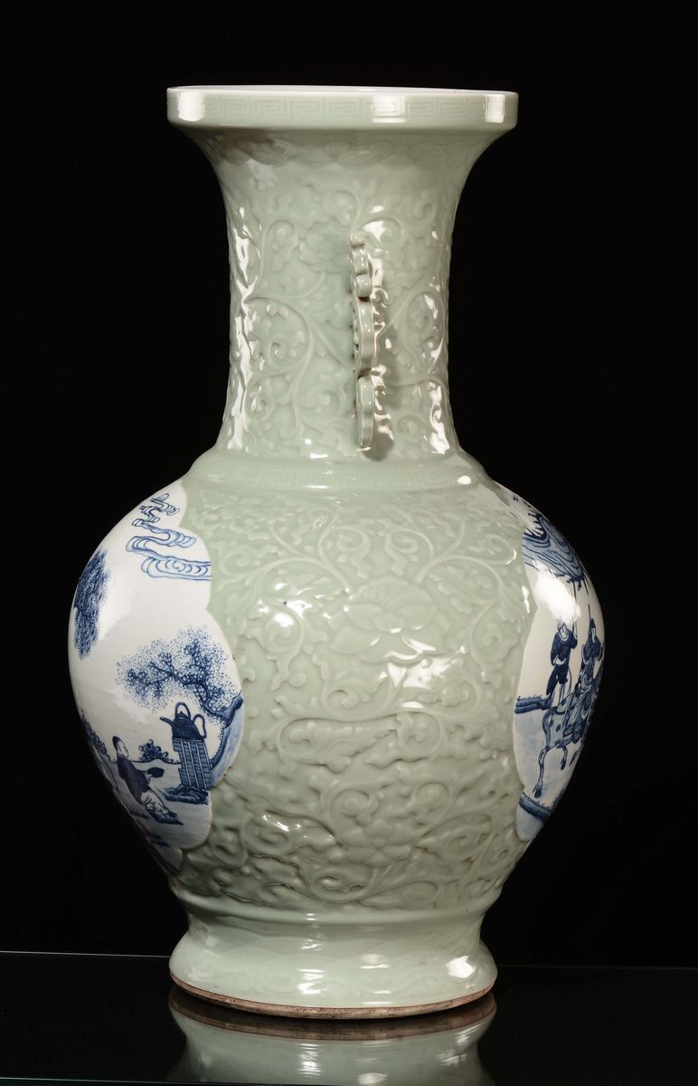 Grande vaso in porcellana Celadon con riserve bianco e blu raffiguranti personaggi in paesaggio, Cina, Dianastia Qing, epoca [..]