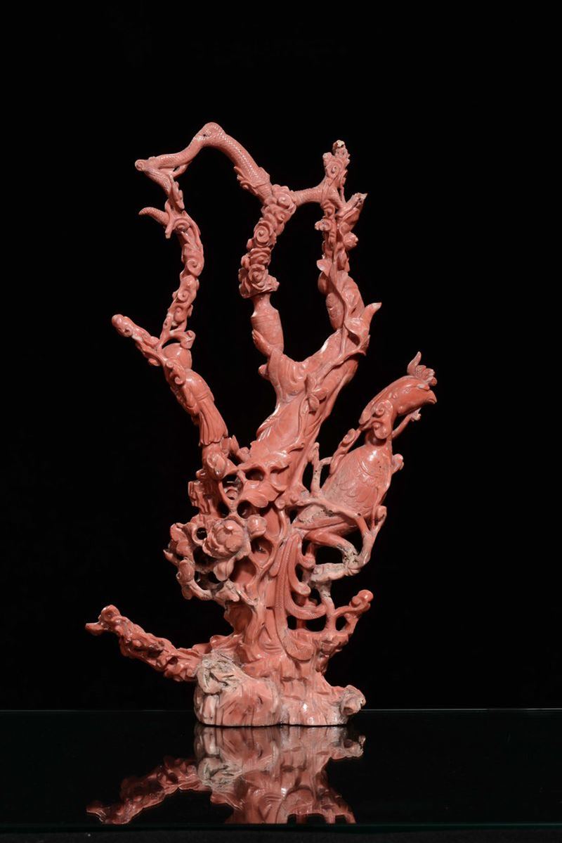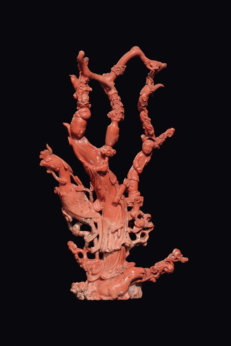 Gruppo in corallo composto da Guanyin con fenice e rami fioriti, Cina, Dinastia Qing, fine XIX secolo