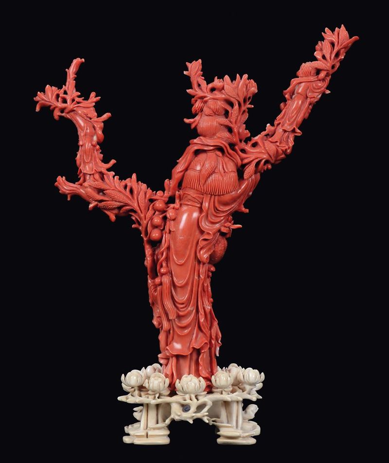 Gruppo in corallo raffigurante Guanyin e fanciulli su ramo, Cina, Dinastia Qing, fine XIX secolo