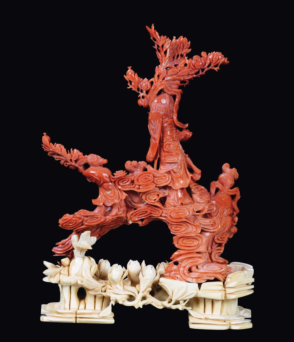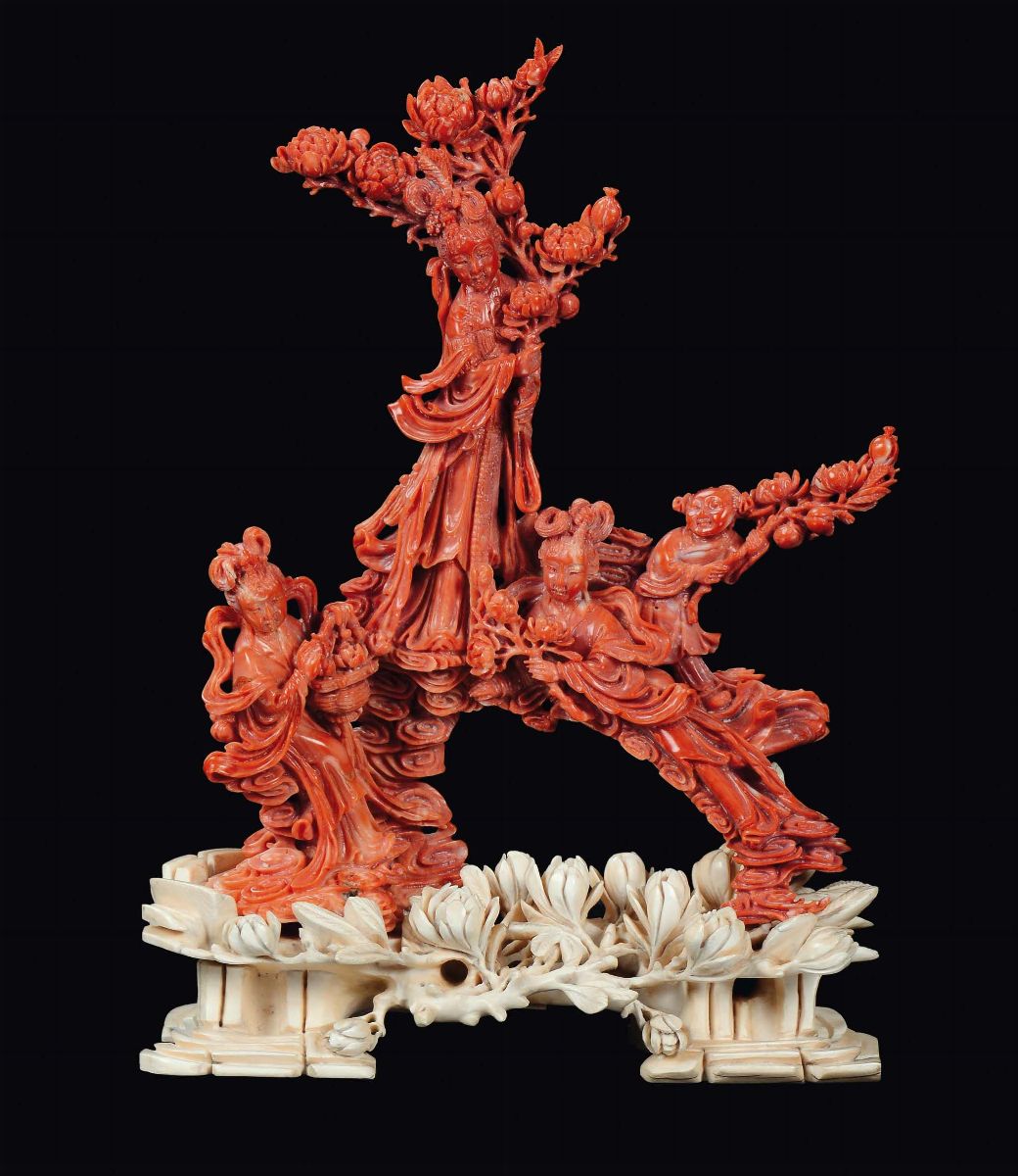 Gruppo in corallo rosso con Guanyin e fanciulli, Cina, Dinastia Qing, fine XIX secolo