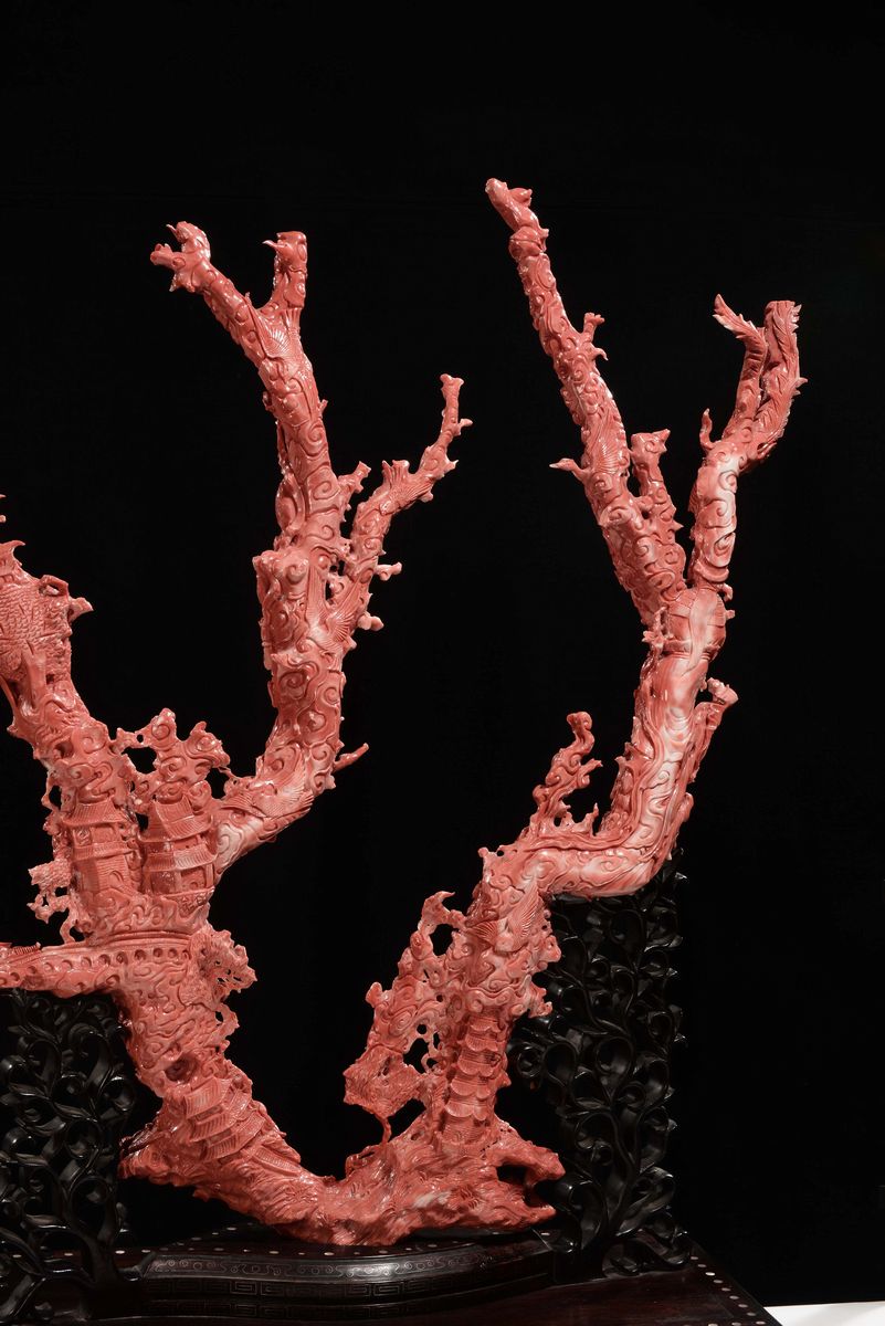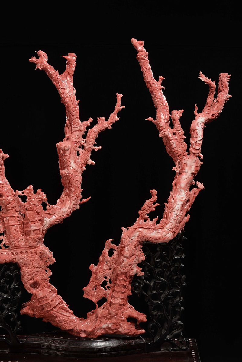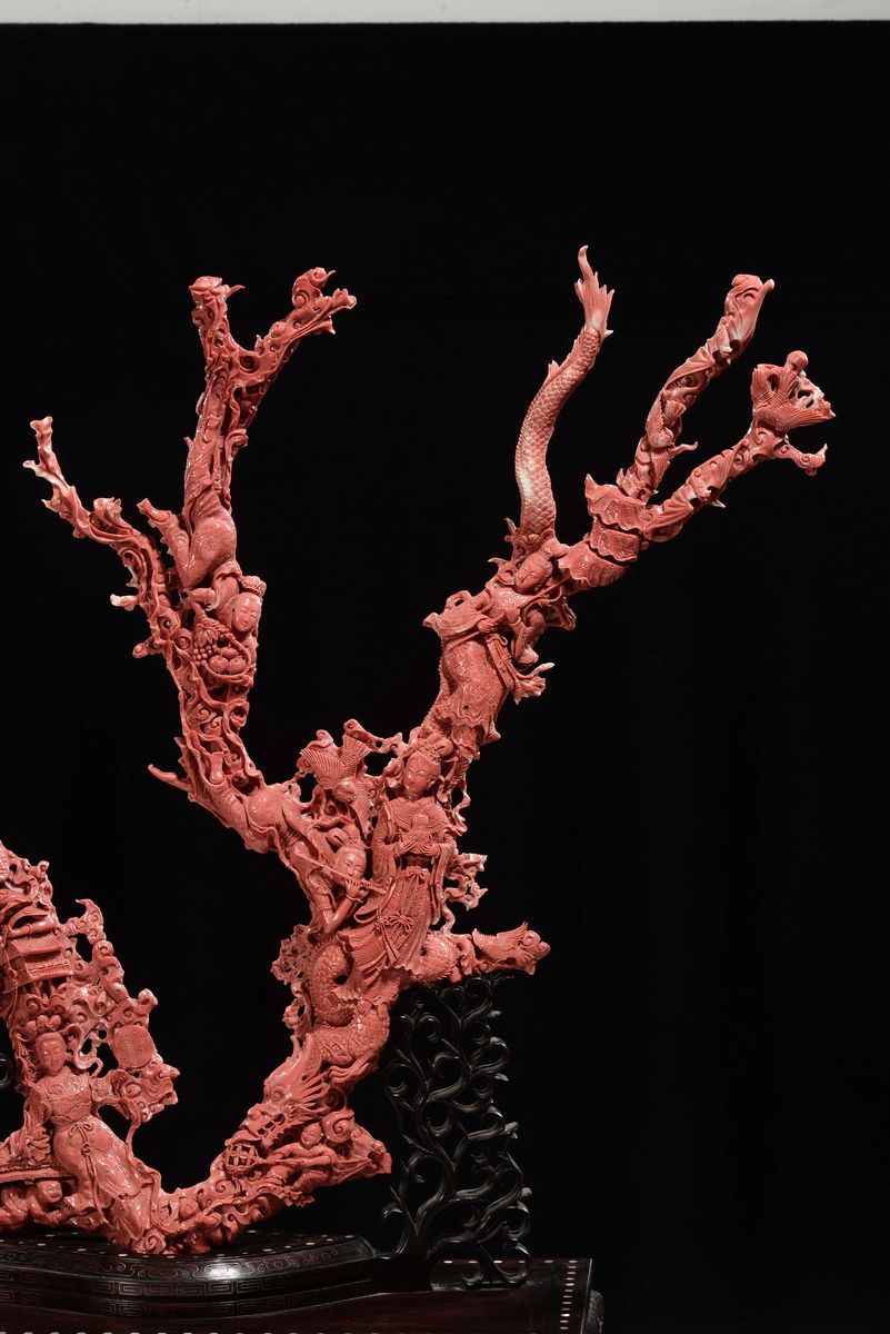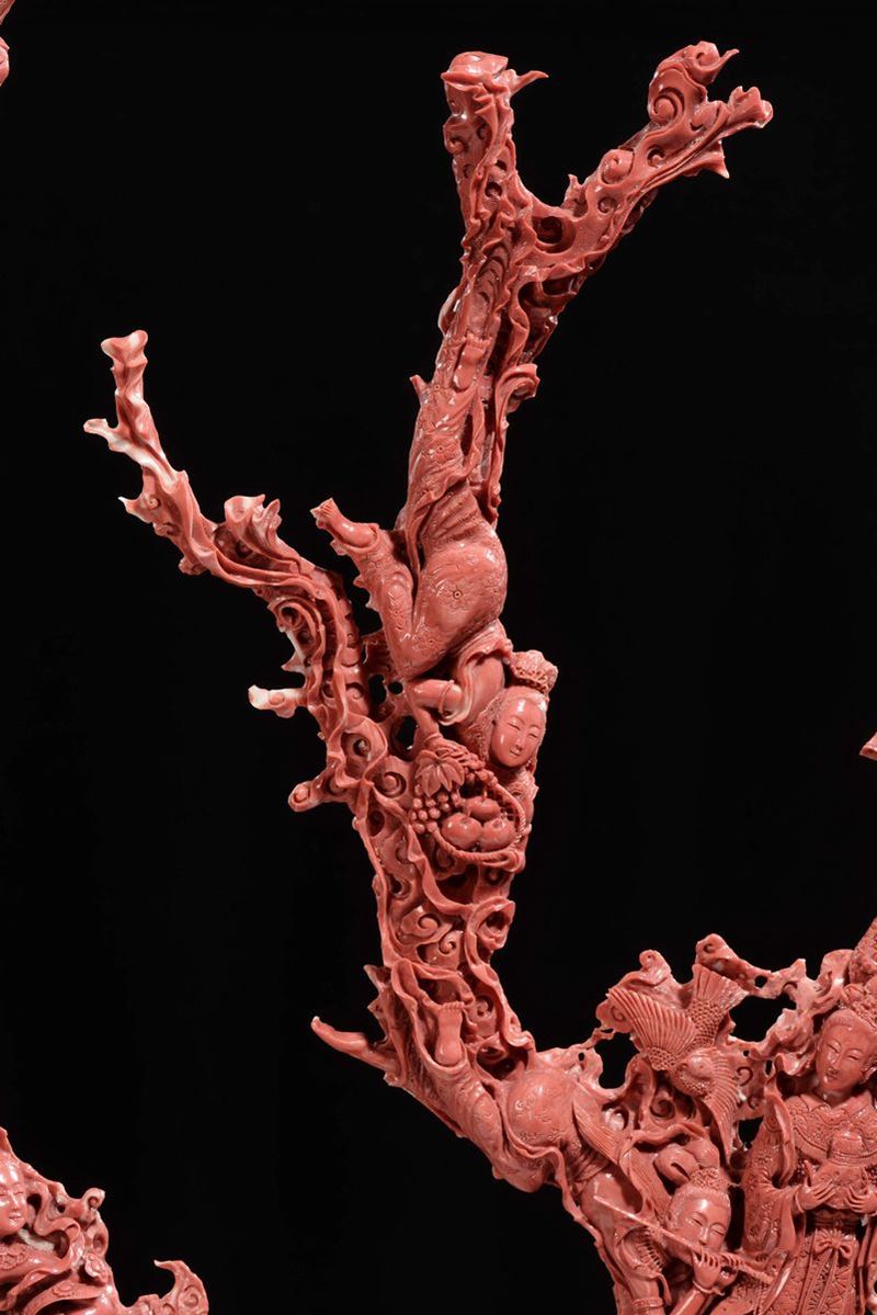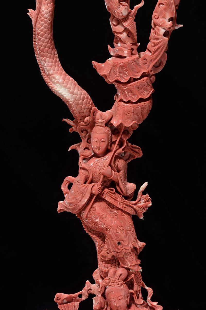 Importante e monumentale corallo rosso scolpito con raffigurazioni di Guanyin, animali e vegetazione, Cina, Dinastia Qing, fine XIX secolo