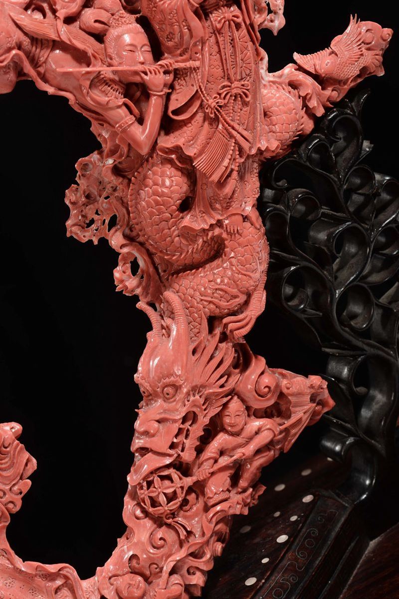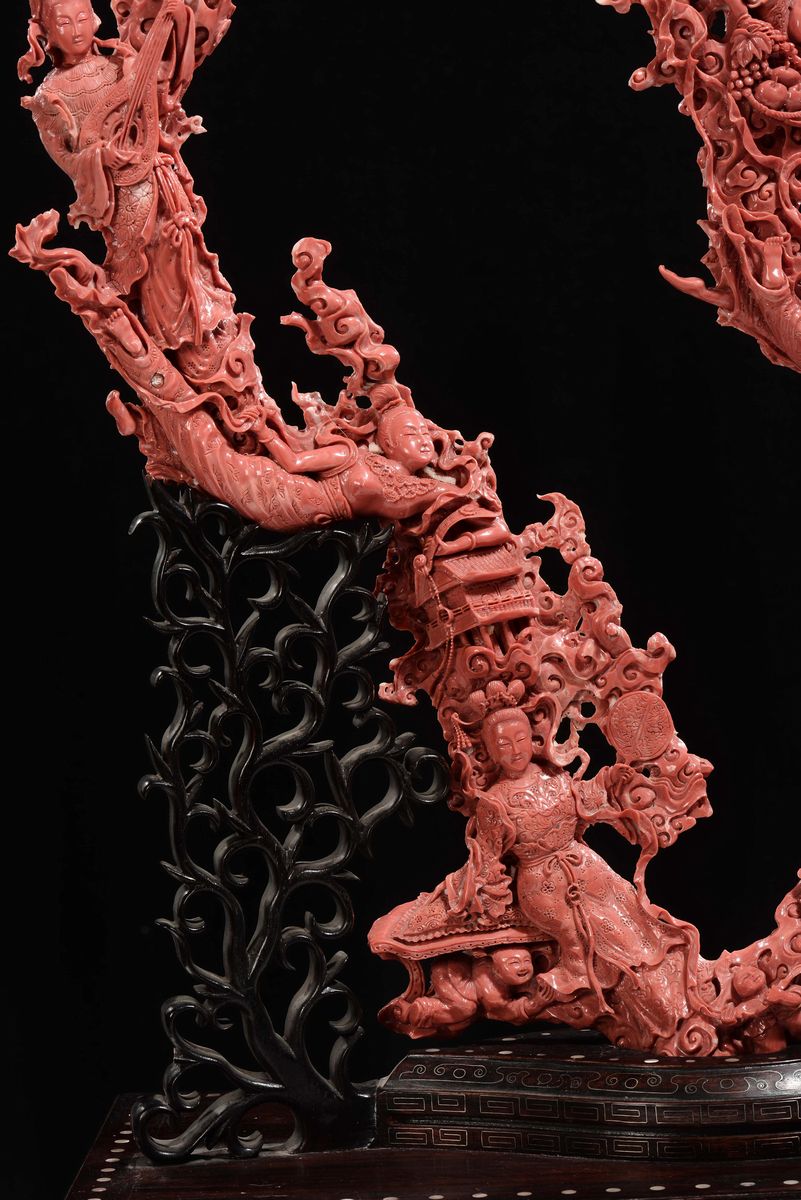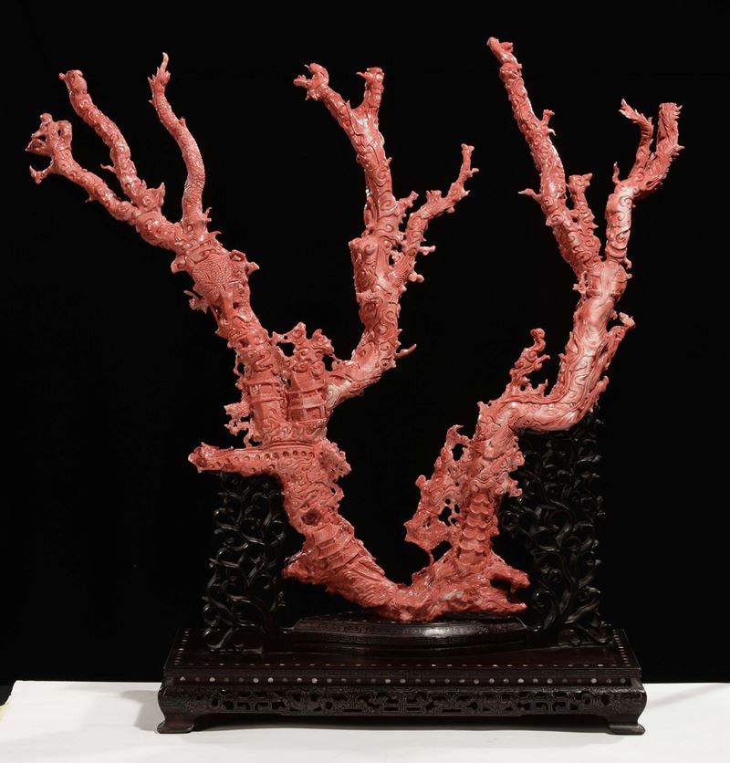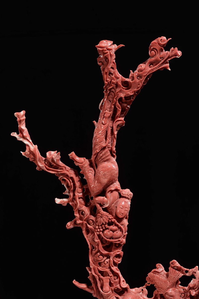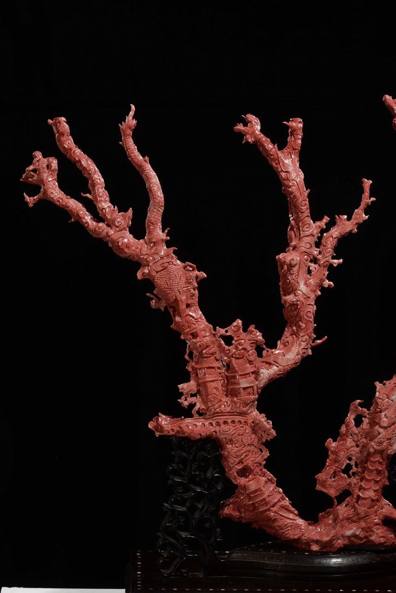 Importante e monumentale corallo rosso scolpito con raffigurazioni di Guanyin, animali e vegetazione, Cina, Dinastia Qing, fine XIX secolo