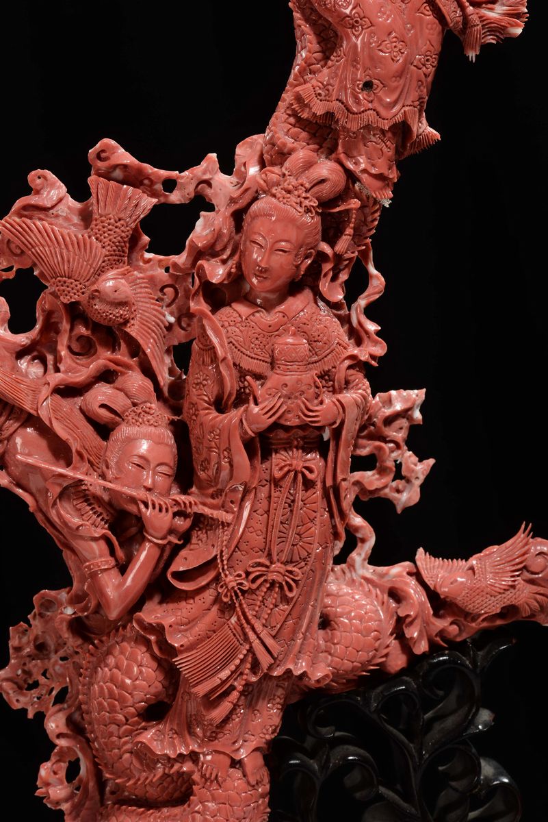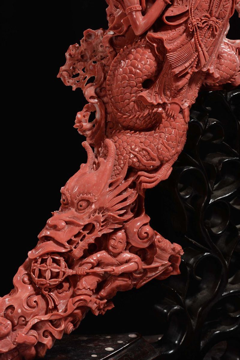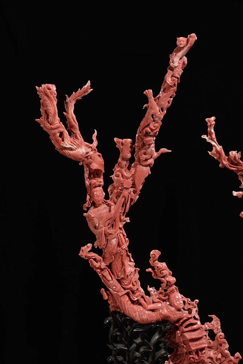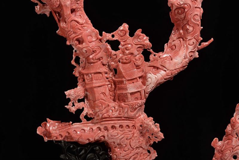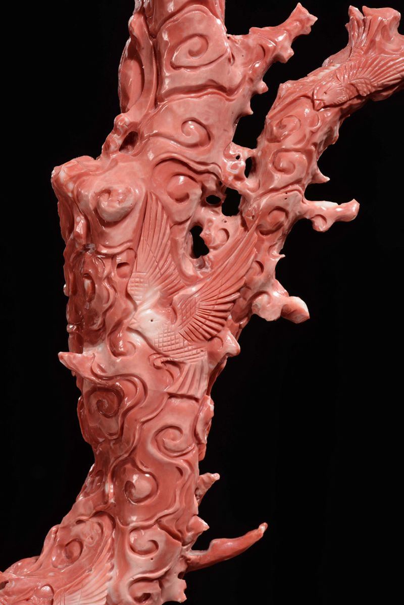 Importante e monumentale corallo rosso scolpito con raffigurazioni di Guanyin, animali e vegetazione, Cina, Dinastia Qing, fine XIX secolo