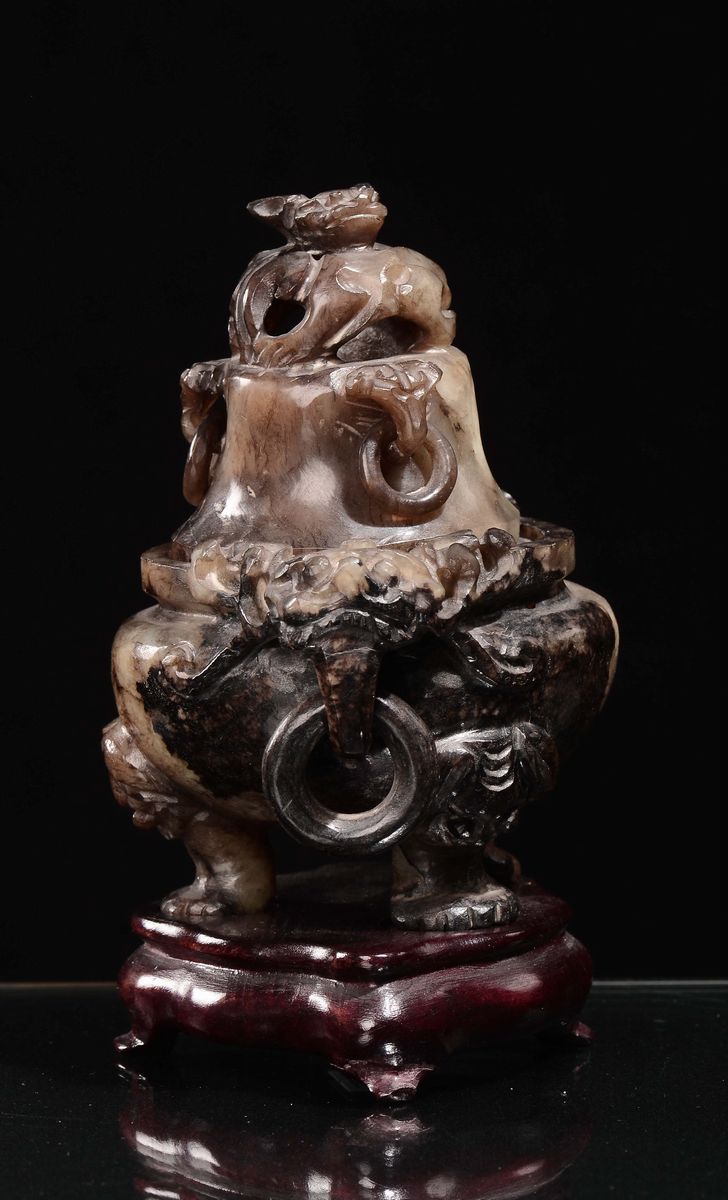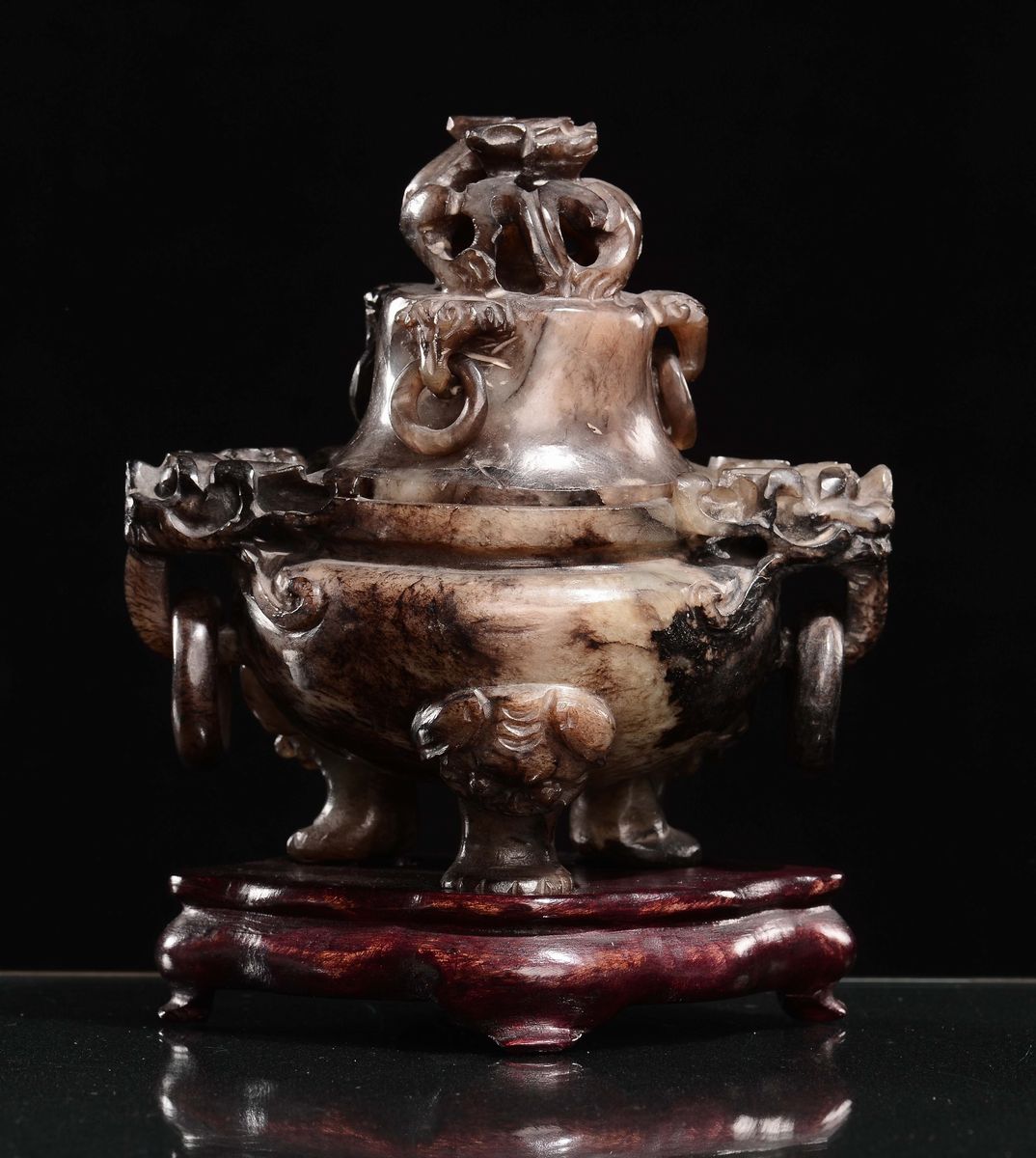 Incensiere con coperchio in giada bianca e marrone di forma arcaica, Cina, Dinastia Qing, XIX secolo