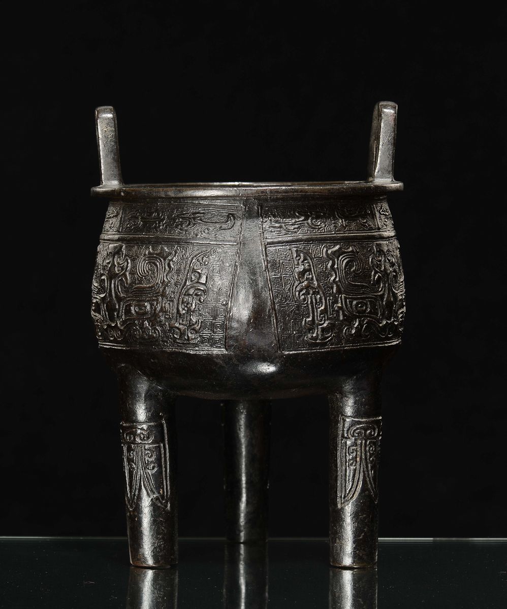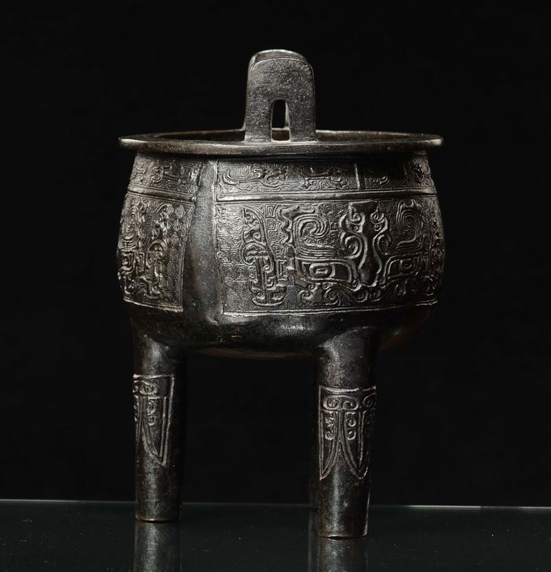 Incensiere tripode di forma arcaica in bronzo decorato, Cina, Dinastia Ming, XVII secolo