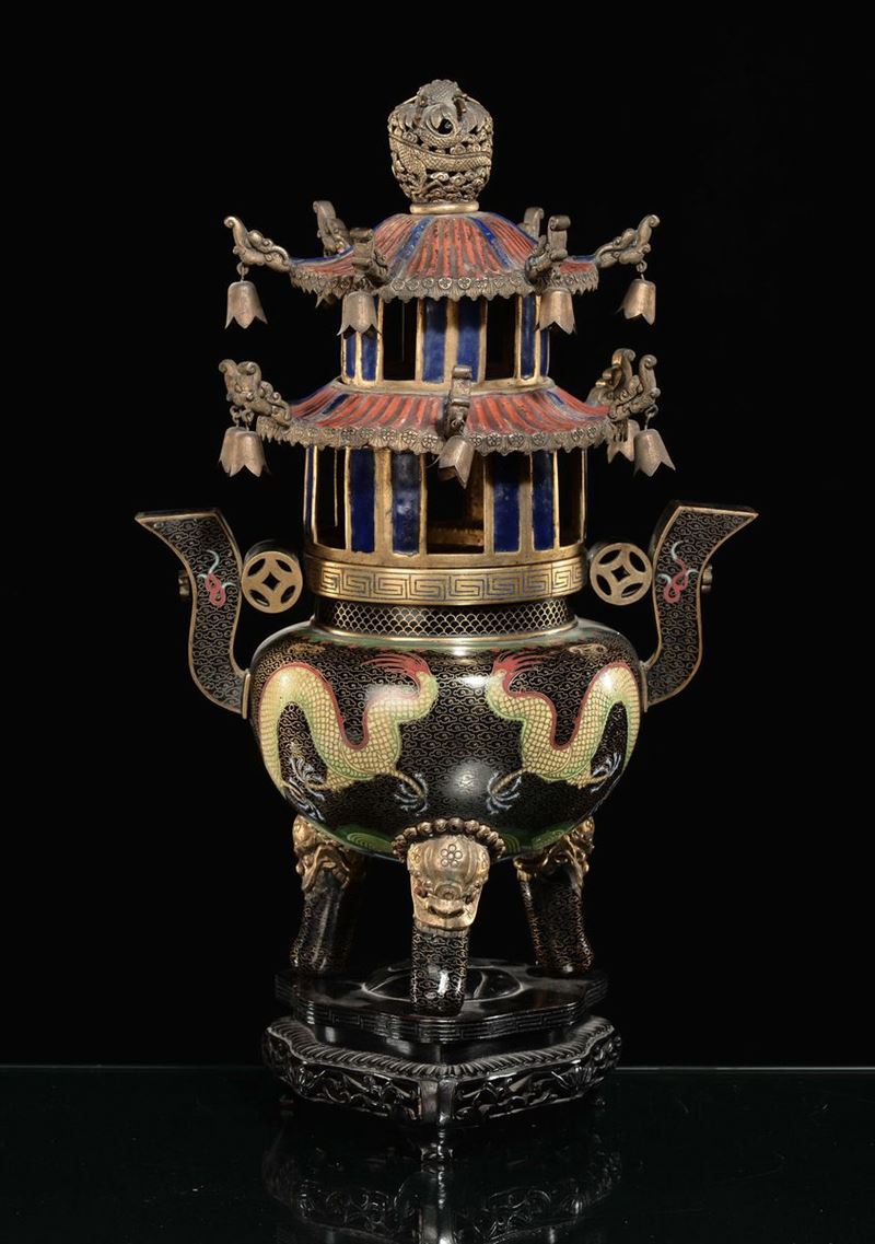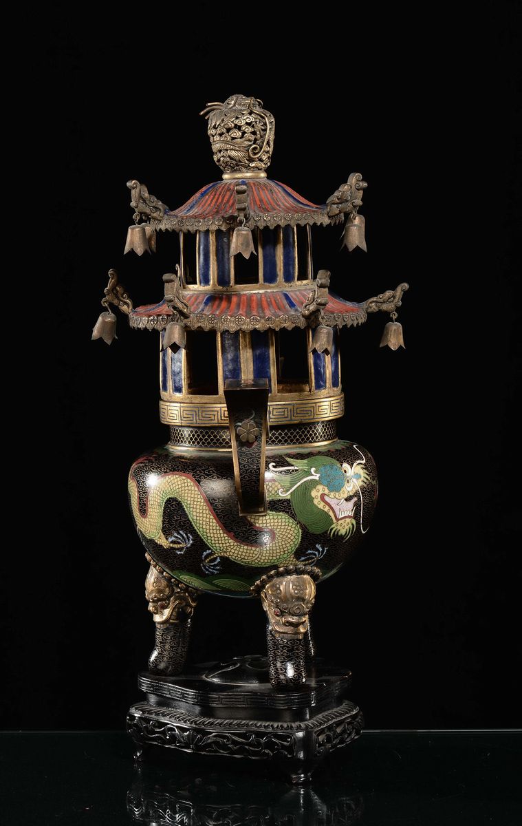 Lanterna cloisonnè a forma di pagoda a fondo nero con draghi, Cina, Dinastia Qing, XIX secolo