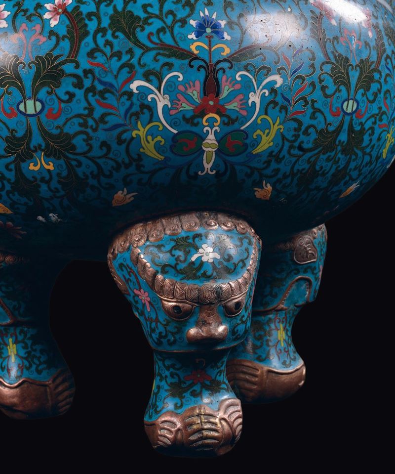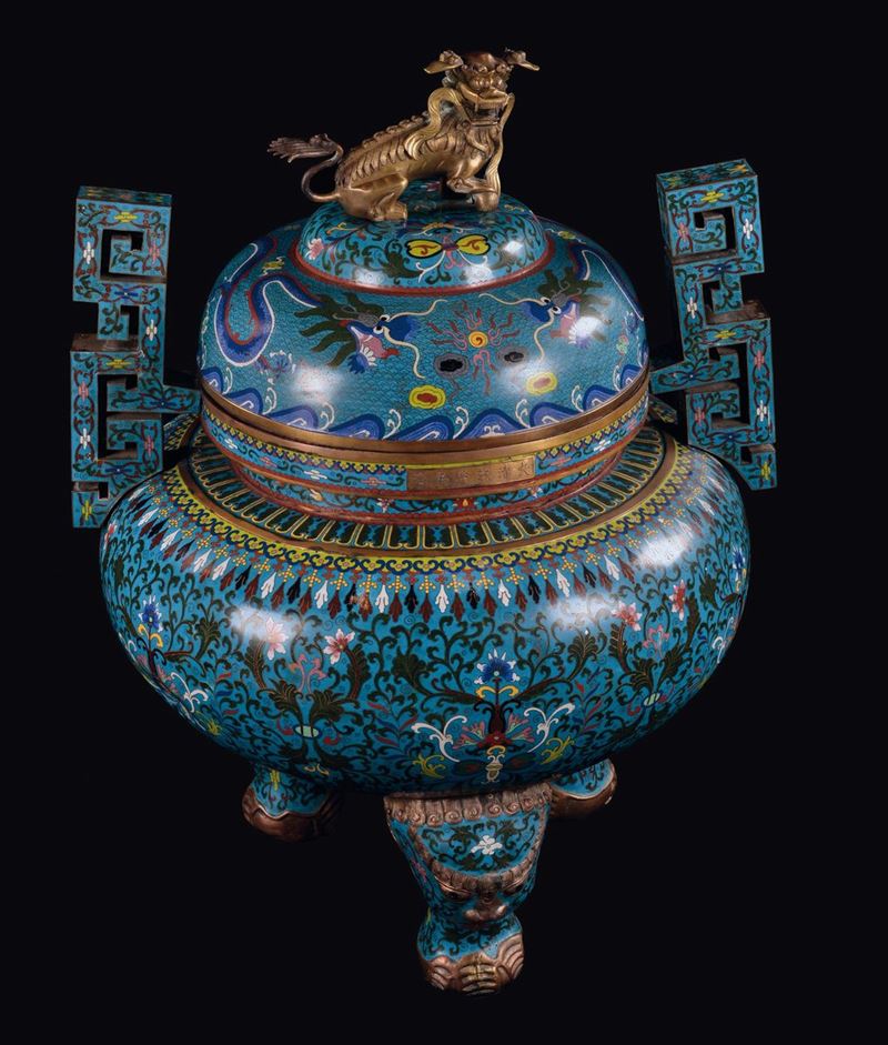 corpo ovoidale poggiante su tre piedi con teste di elefanti, grande anse a greca, decorazione a motivi vegetali stilizzati su fondo azzurro, cane di Pho in bronzo dorato sul coperchio, marchio Qianlong apocrifo a sei caratteri, cm 73x65x100