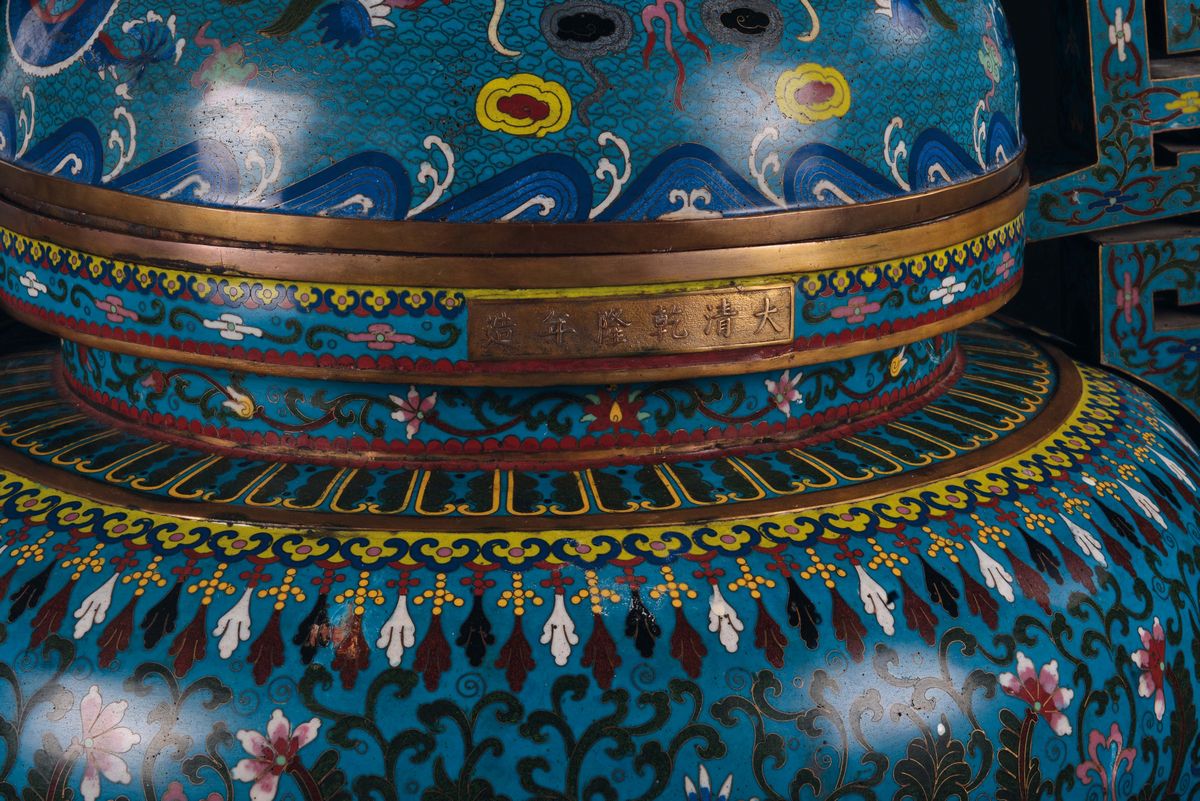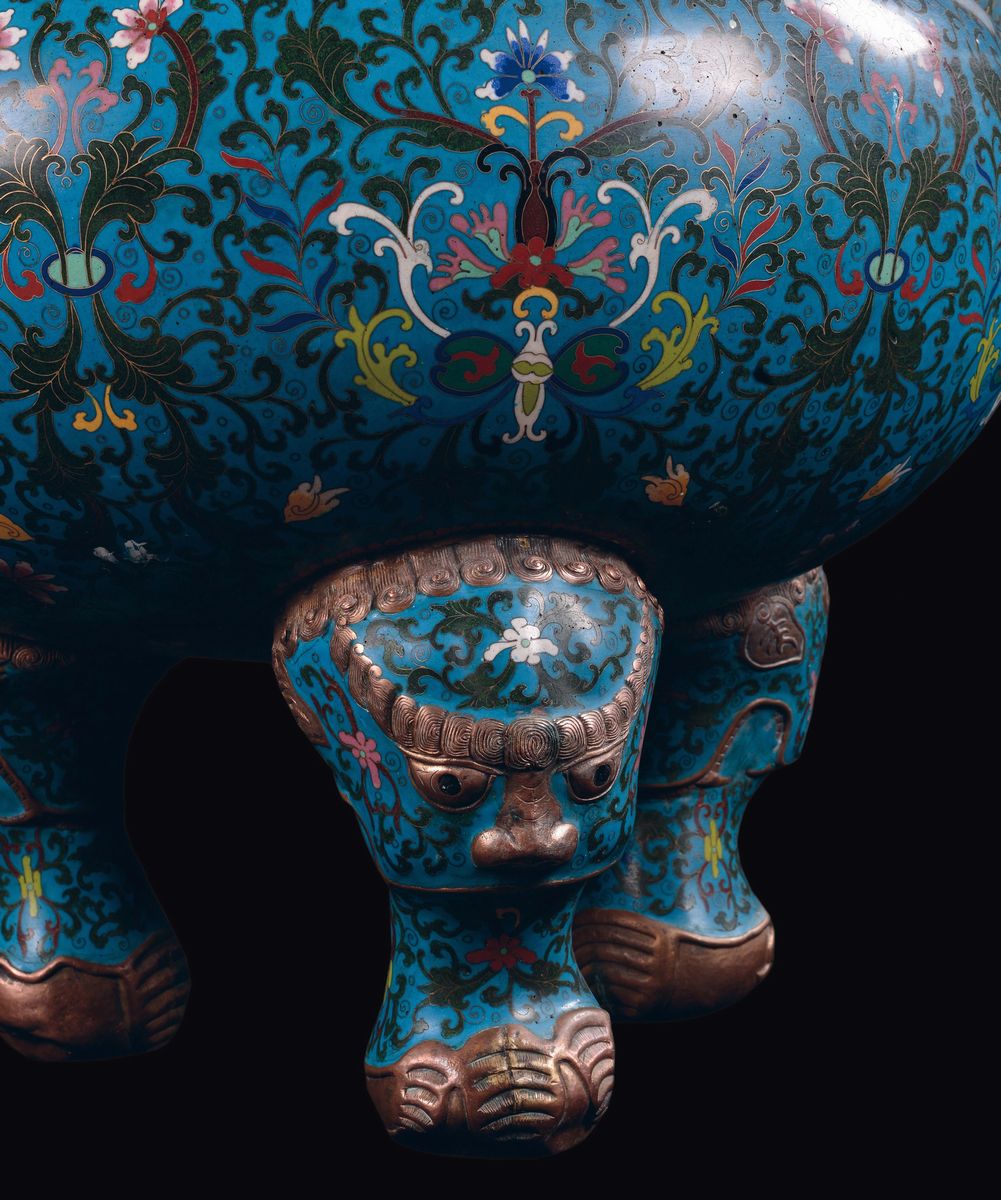 Monumentale censer in bronzo dorato e smalti cloisonné, Cina, Dinastia Qing, XIX secolo