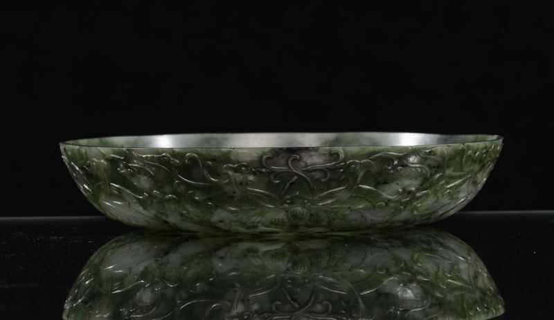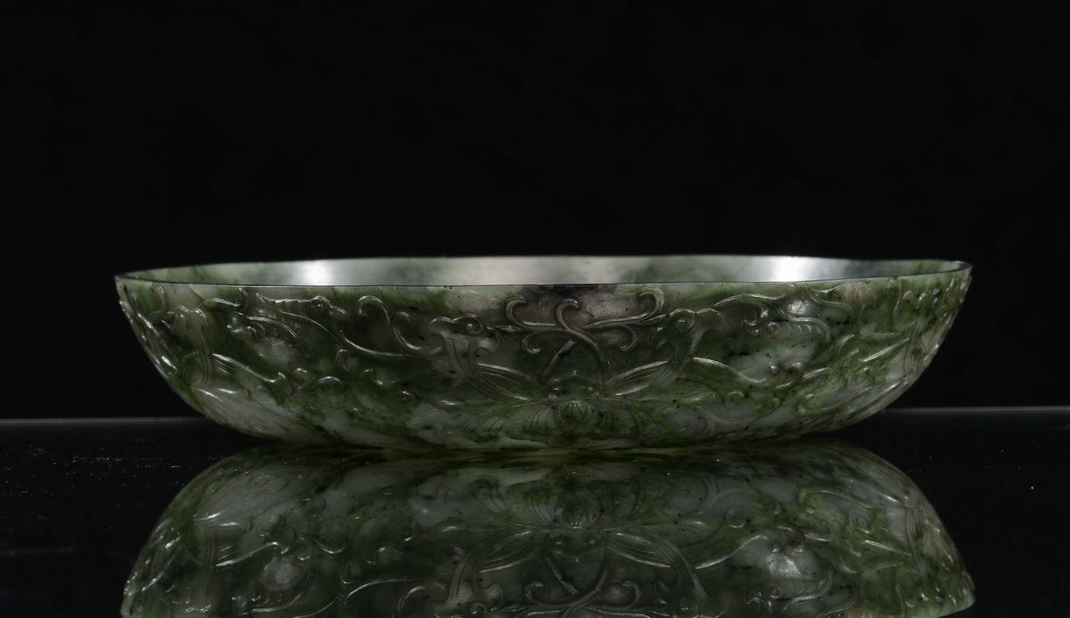 Piattino in giada spinacio di gusto Mogul, Cina, Dinastia Qing, epoca Qianlong (1736-1796)