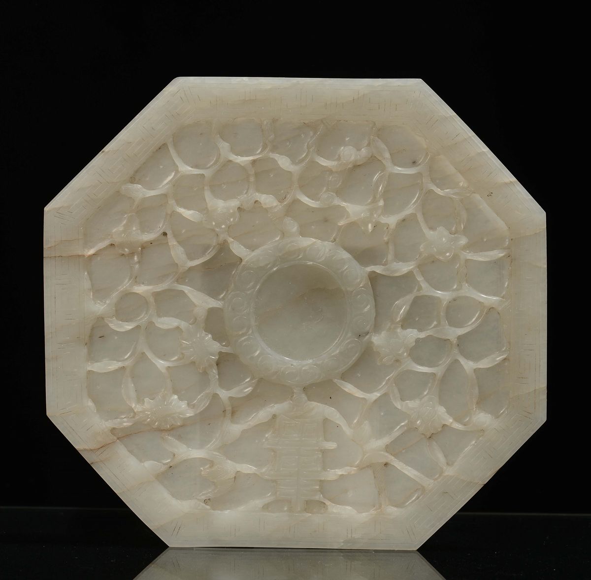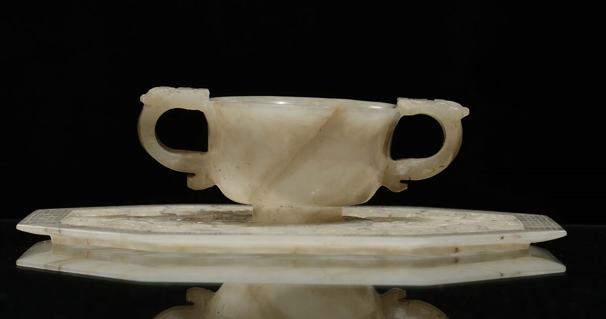 Piattino Mogul in giada Celadon finemente inciso con coppetta, Cina, Dinastia Qing, epoca Qianlong (1736-1796)