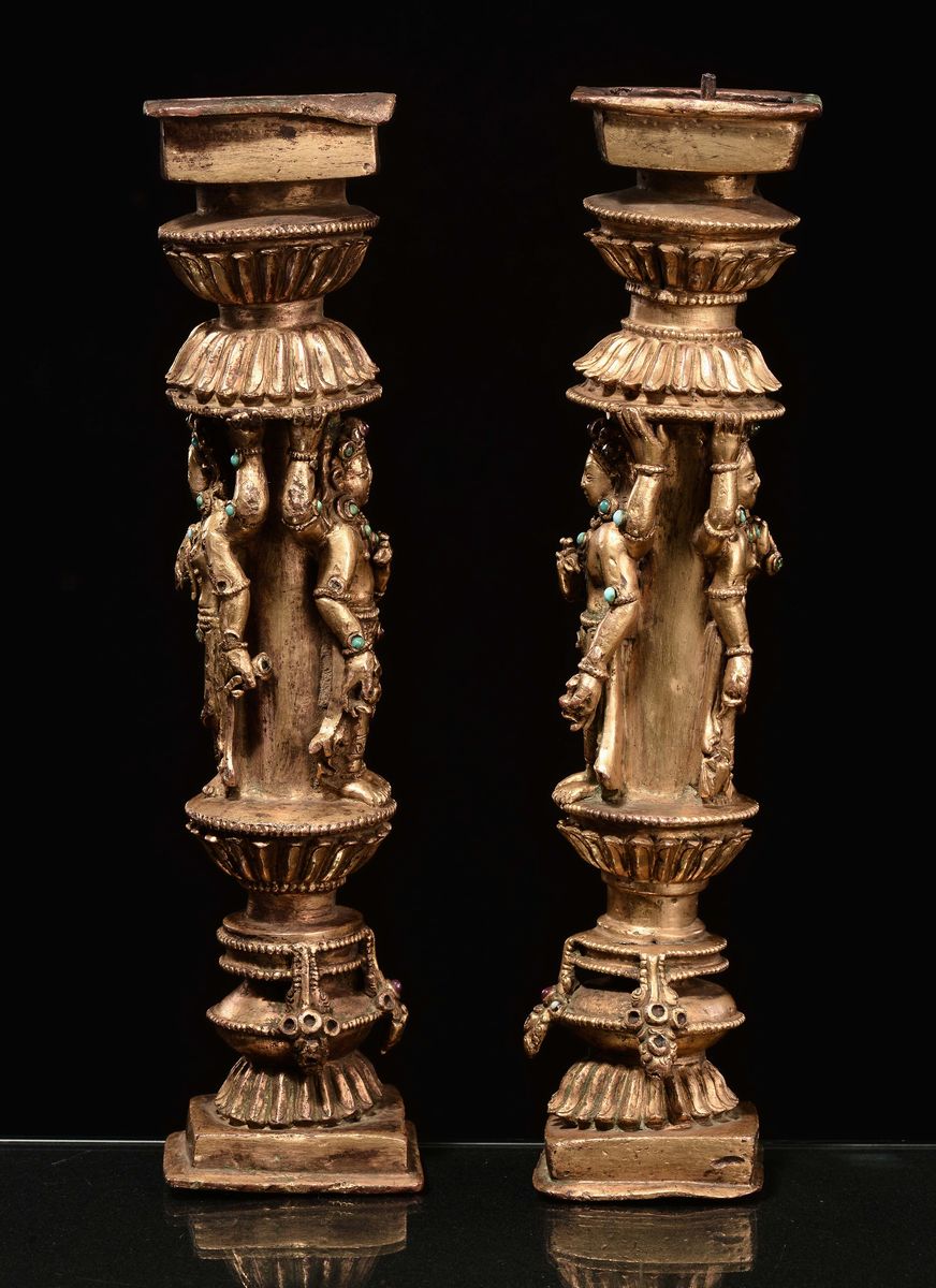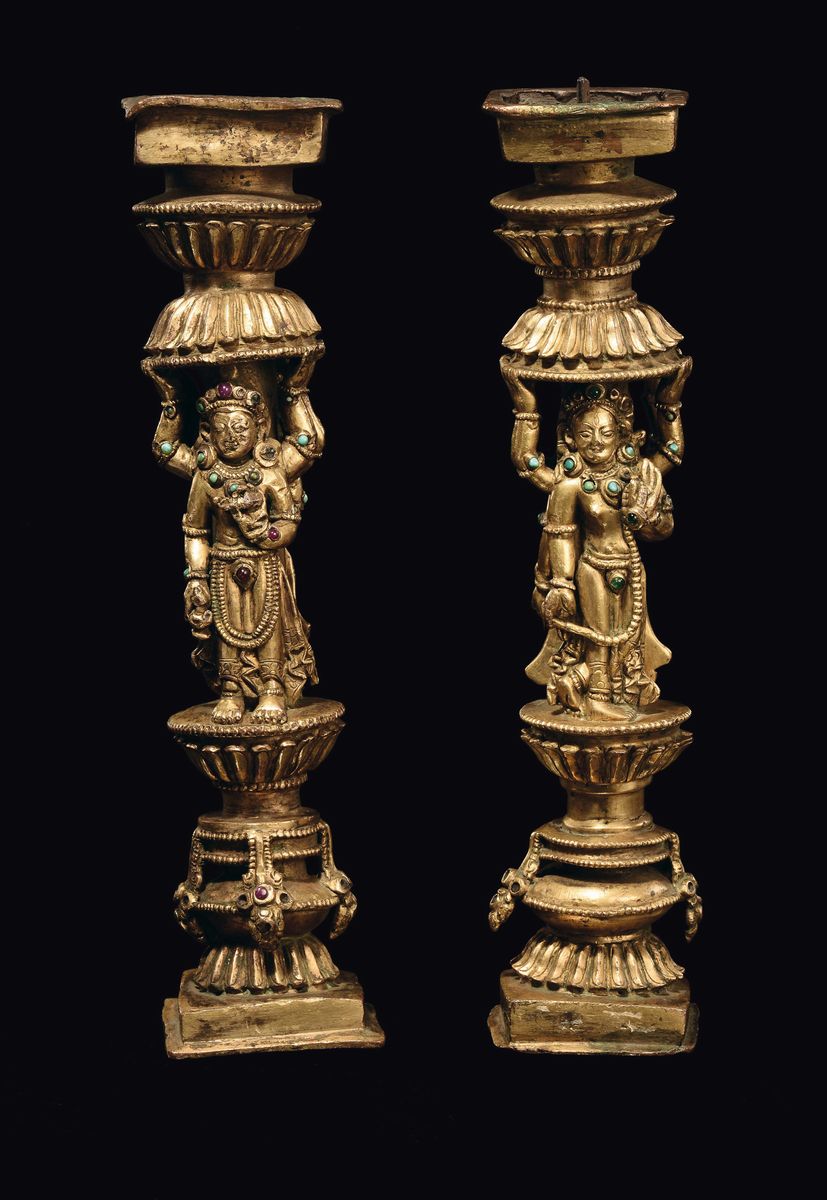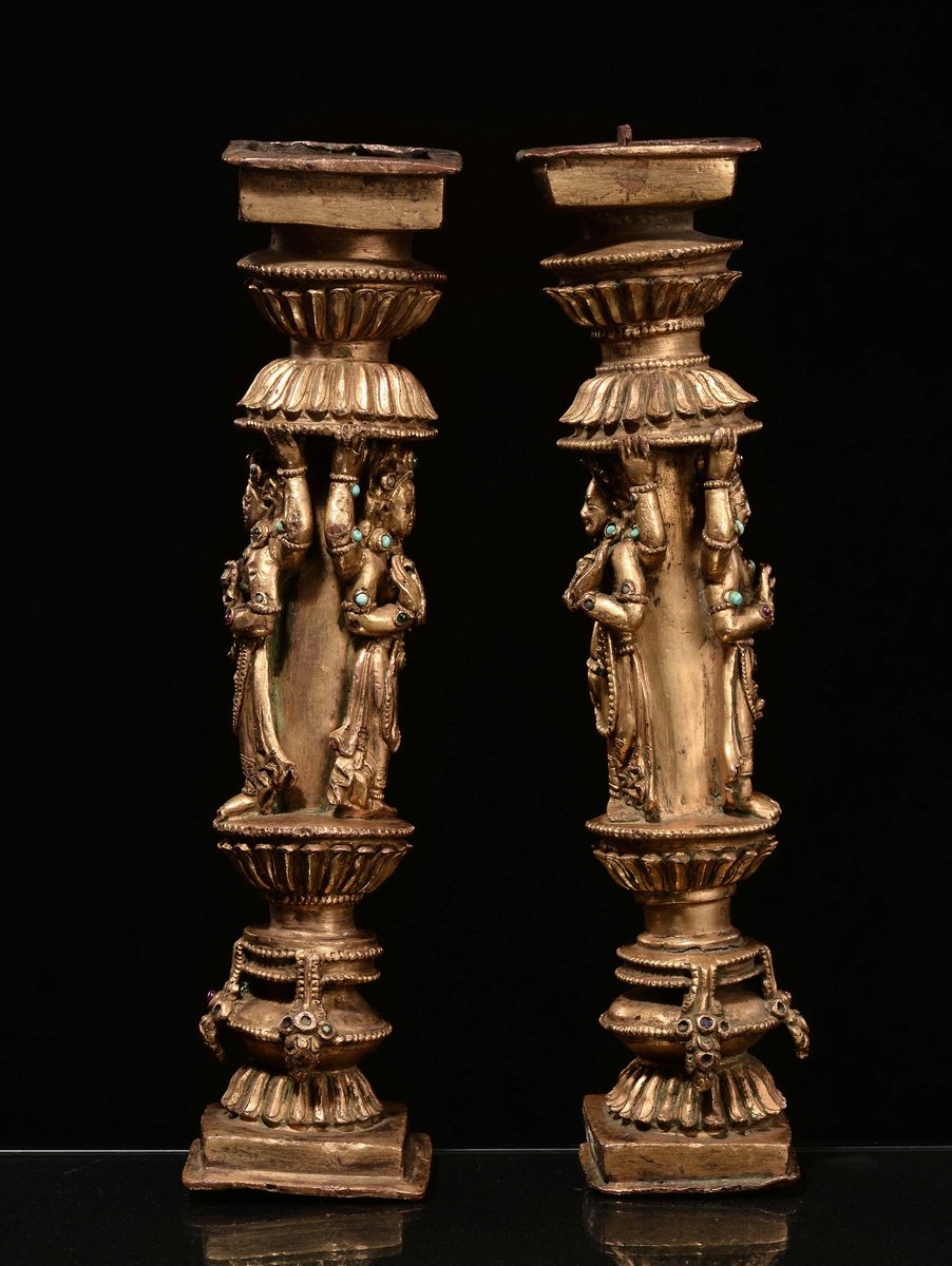 Rara coppia di ornamenti in bronzo dorato e pietre dure nel gusto del monastero di Densatil, Tibet, XV secolo
