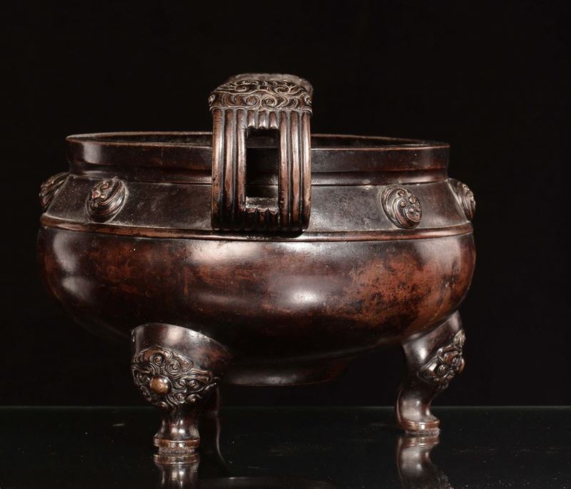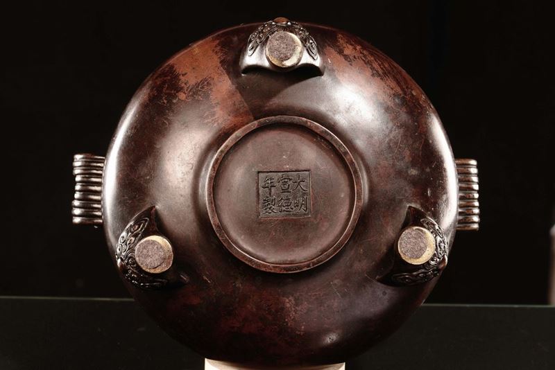 Rarissimo incensiere in bronzo inciso a due manici, Cina, Dinastia Qing, epoca Kangxi (1662-1722)