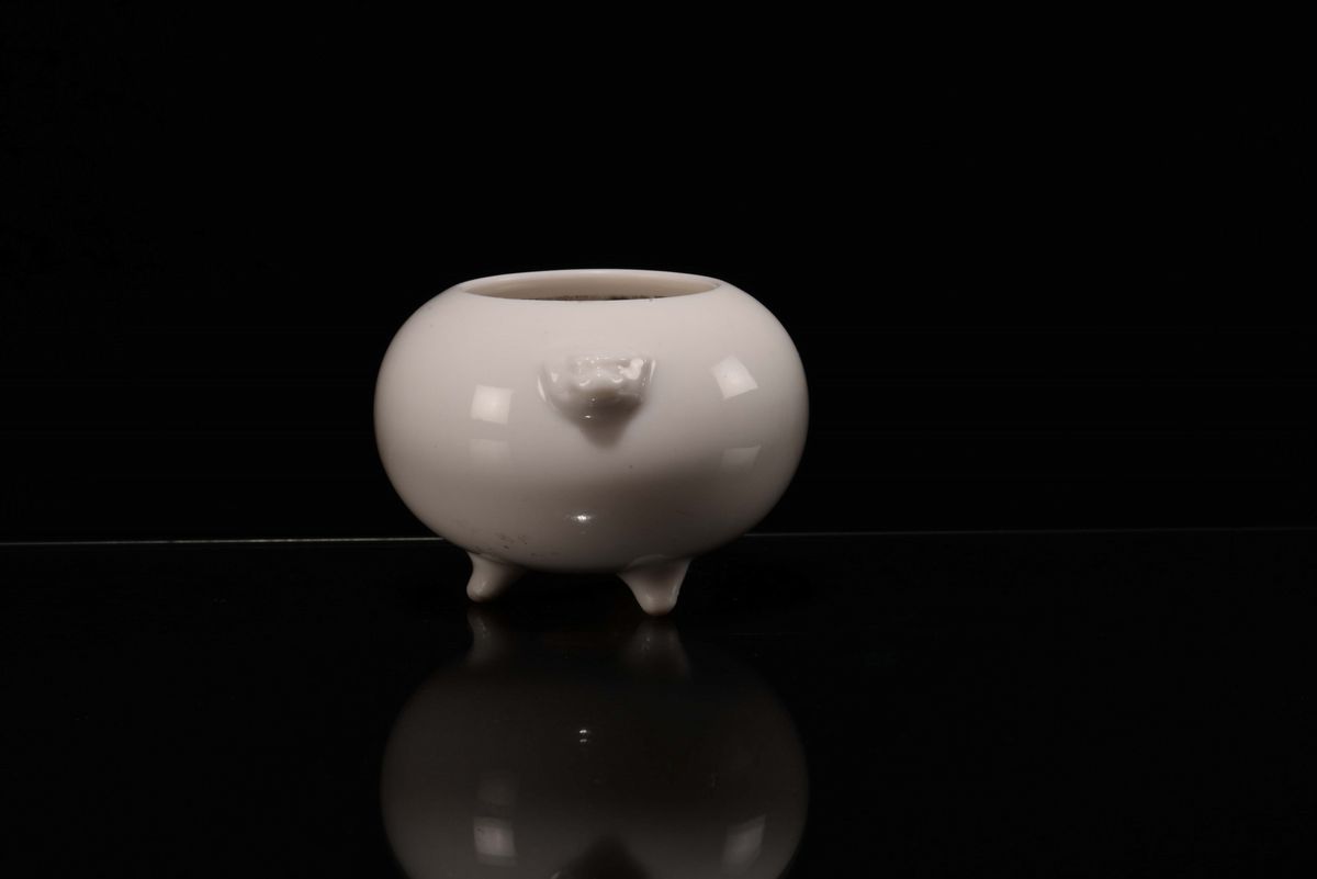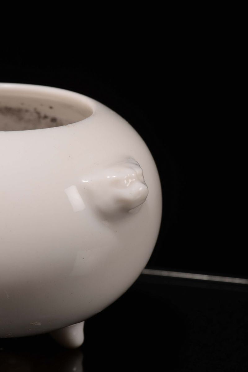 Raro incensiere tripode in porcellana Blanc de Chine con mascheroni a rilievo, Dehua, Cina, Dinastia Qing, fine XVII secolo