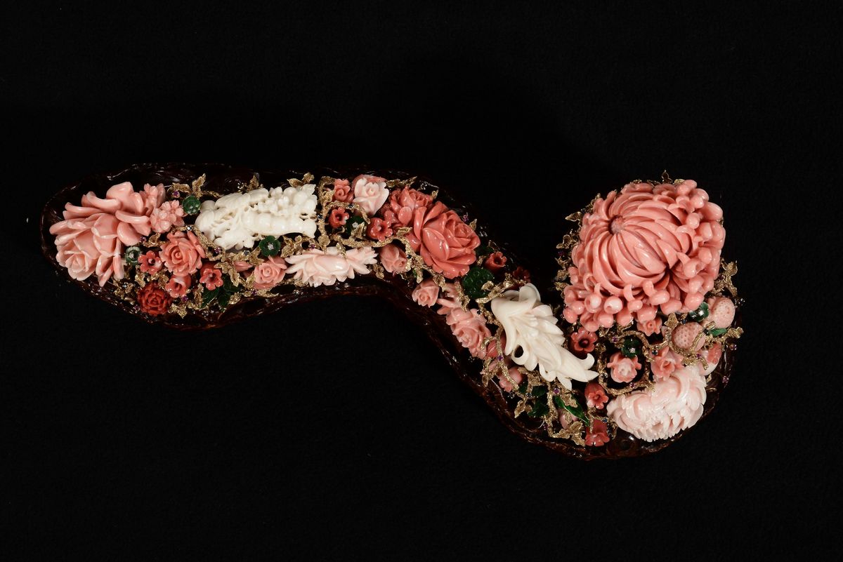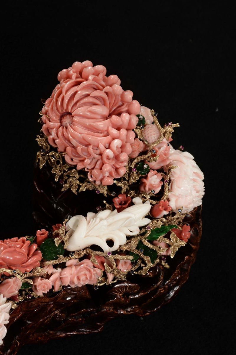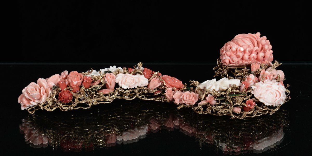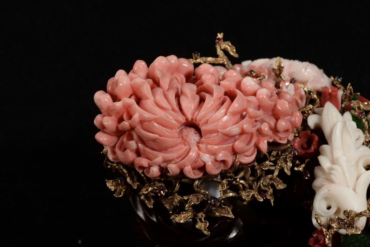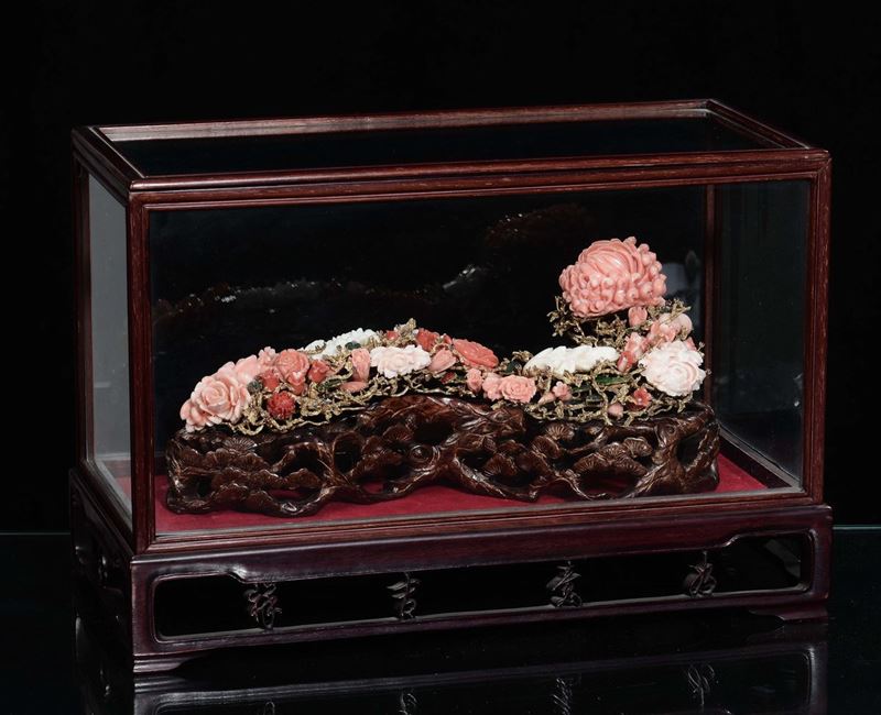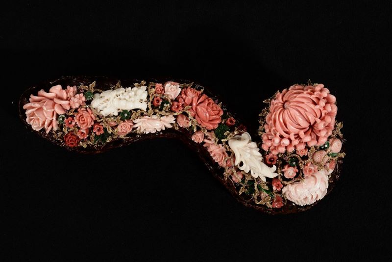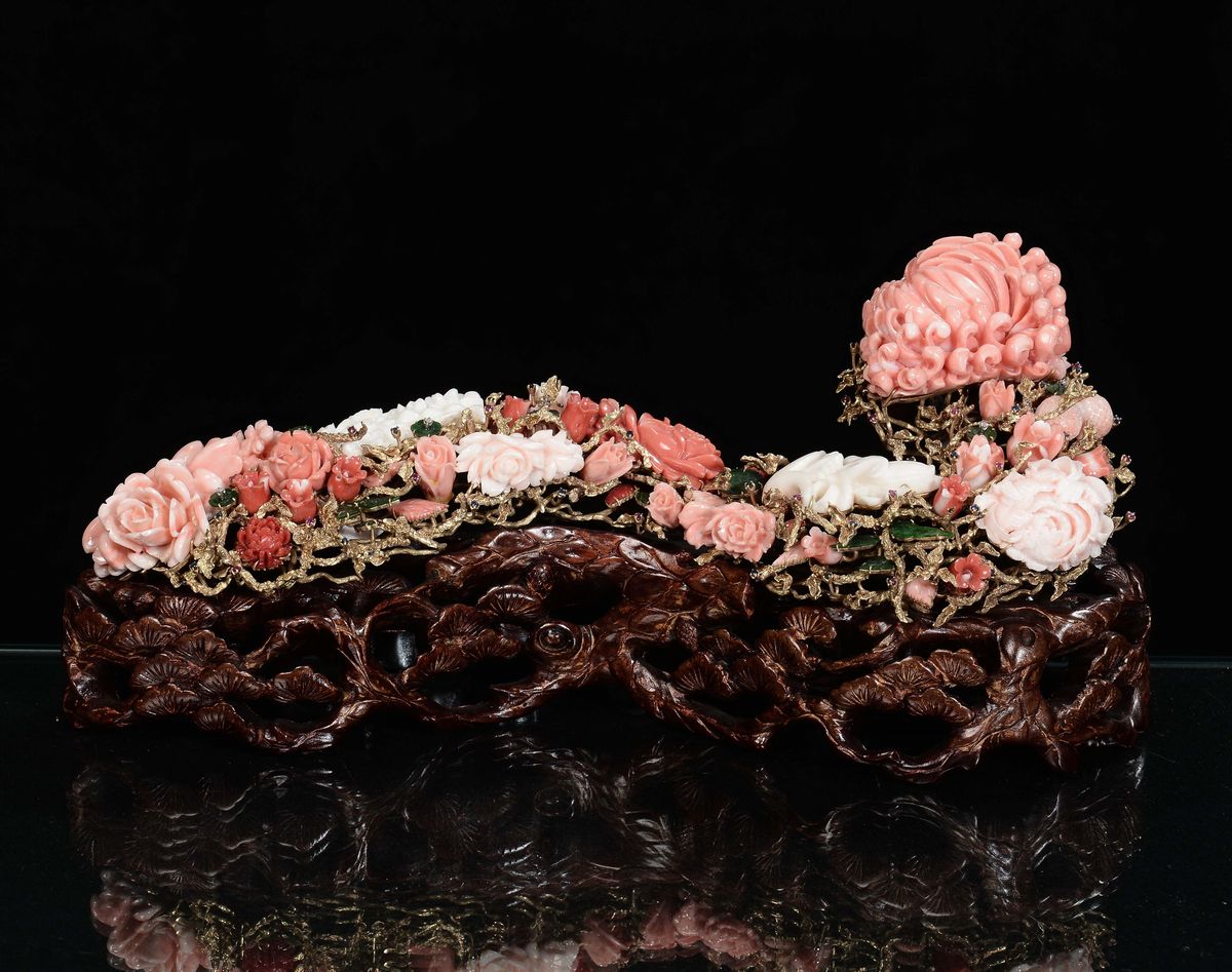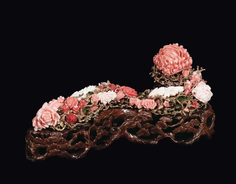 Raro ruyi in oro e corallo rosa scolpito a boccioli di rosa con base in legno riccamente intagliata, Cina XX secolo