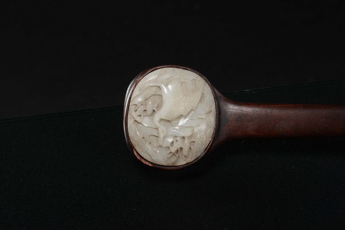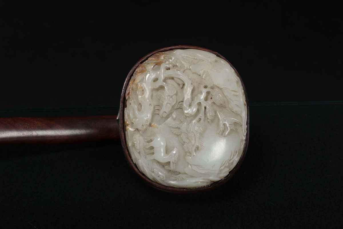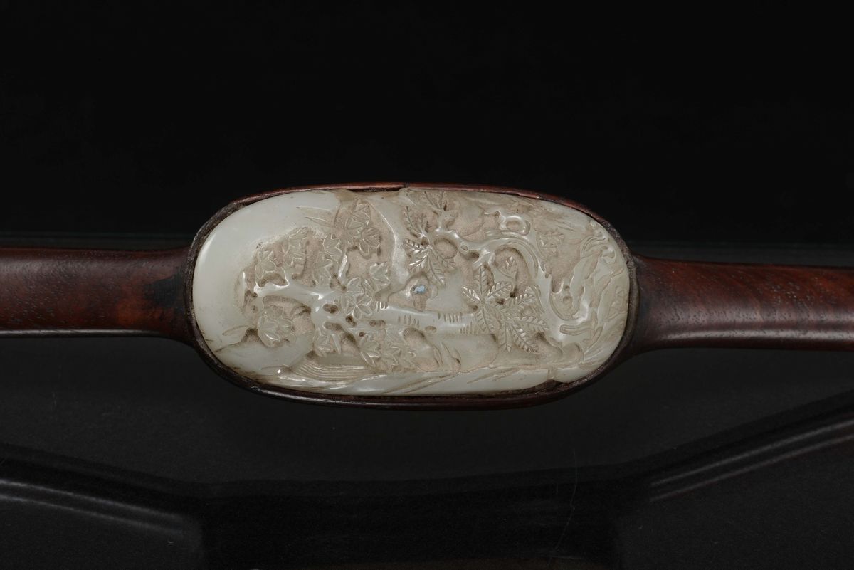 Ruyi in legno di homu con placche di giada Celadon a soggetto naturalistico, Cina, Dinastia Qing, epoca Qianlong (1736-1796)