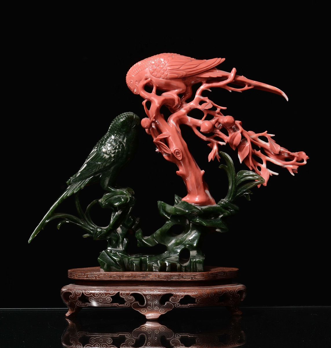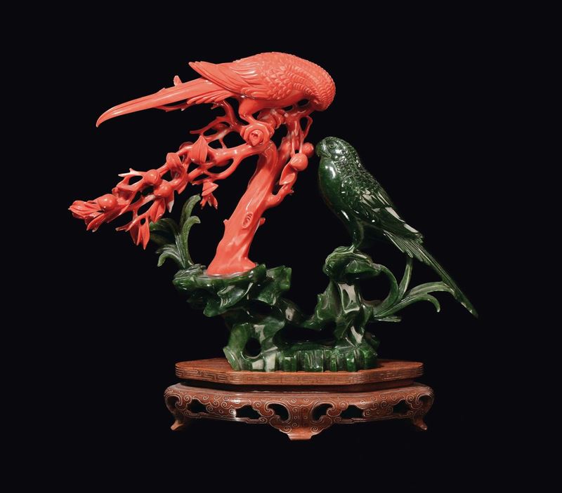 Scultura raffigurante due pappagalli, uno in corallo e uno in giada verde spinacio, Cina, inizio XX secolo