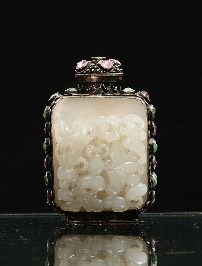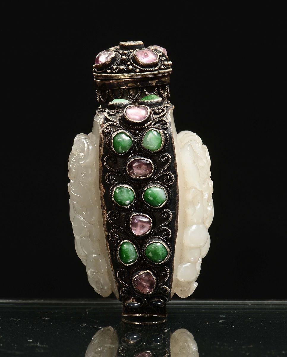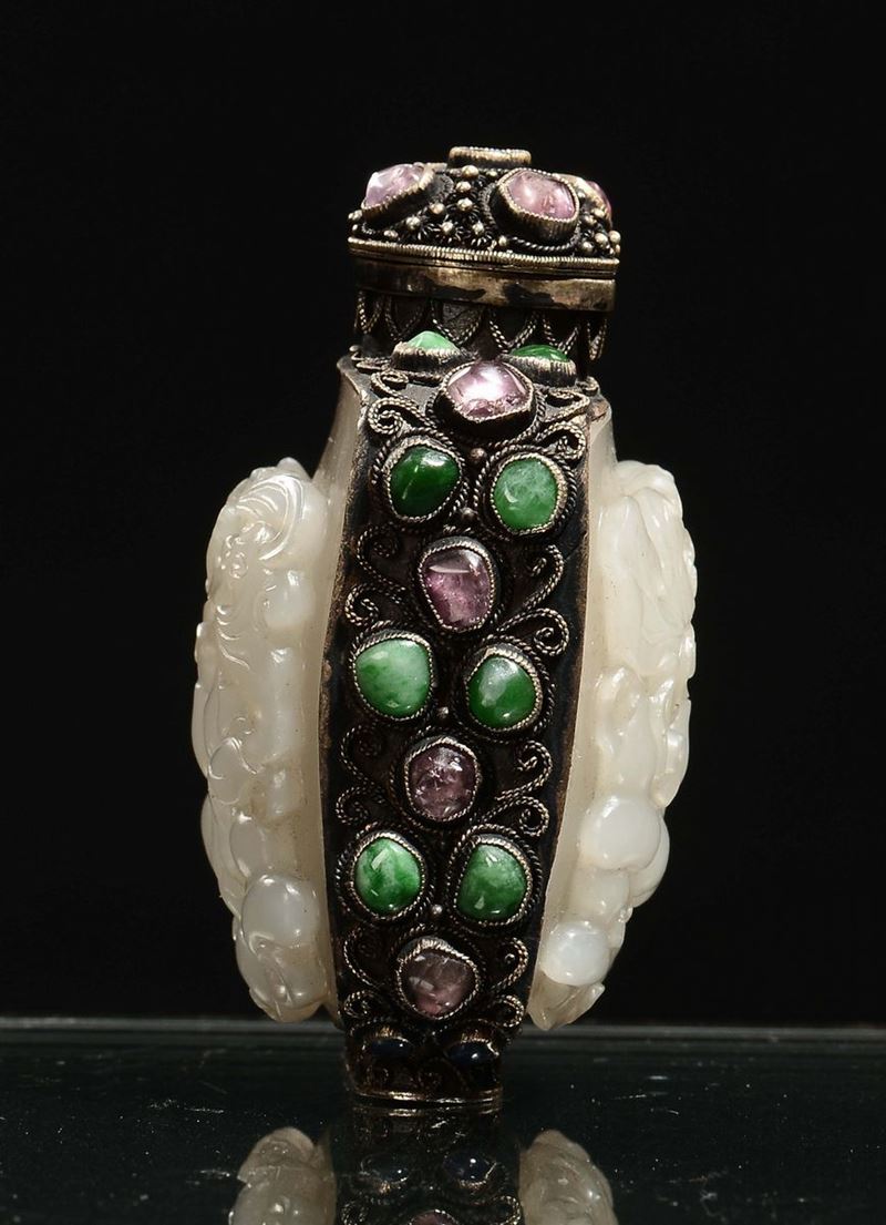 Snuff bottle in bronzo e giada bianca con pietre dure, Cina, Dinastia Qing, epoca Qianlong (1736-1796)