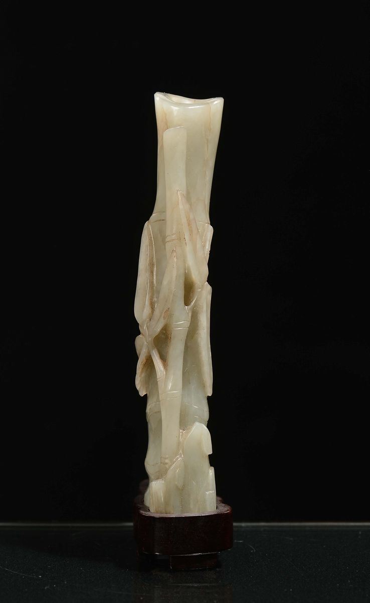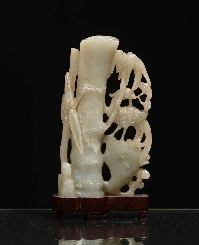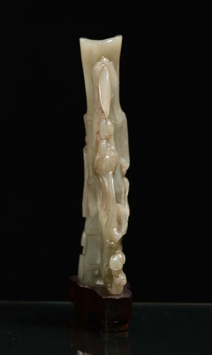 Vasetto in giada Celadon con bamboo, fiori e uccello, Cina, Dinastia Ming, XVII secolo