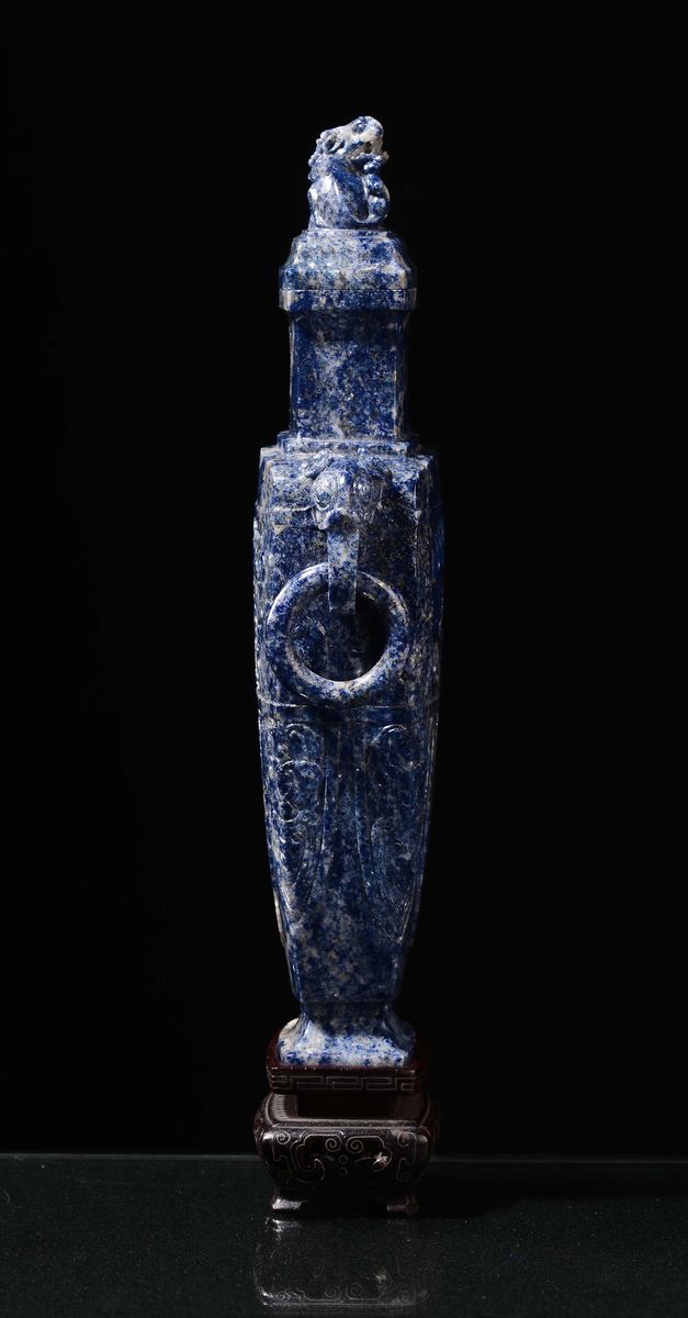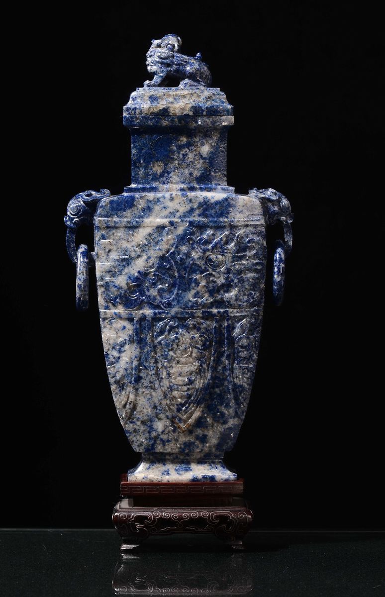 Vaso biansato con coperchio in lapislazzulo con incisione a decoro arcaico, Cina, Dinastia Qing, XIX secolo
