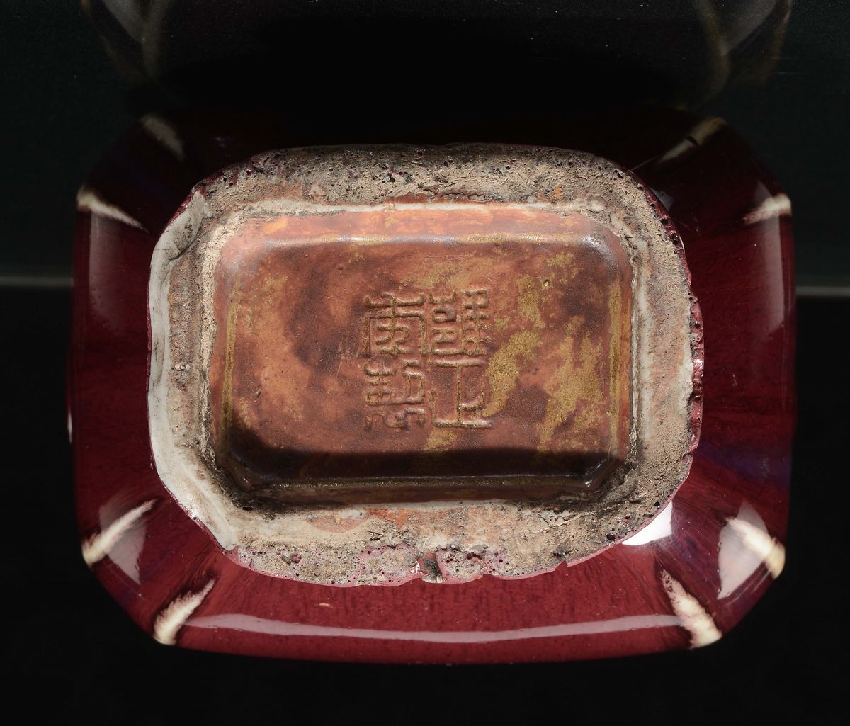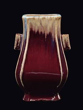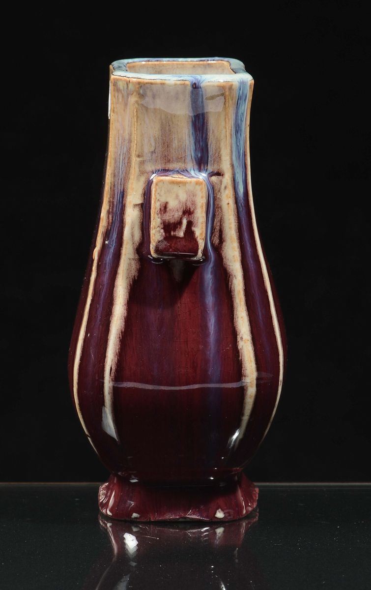 Vaso in porcellana a doppia ansa con decoro flambè sui toni del bodeaux, Cina, Dinastia Qing, fine XIX secolo