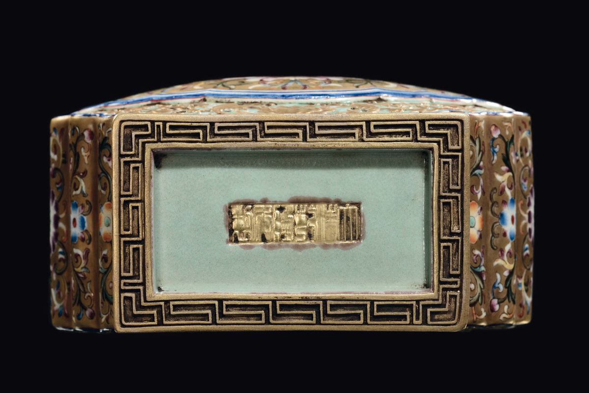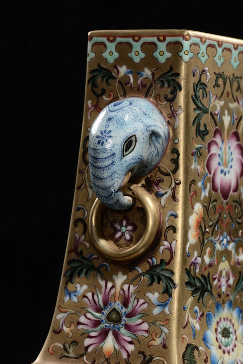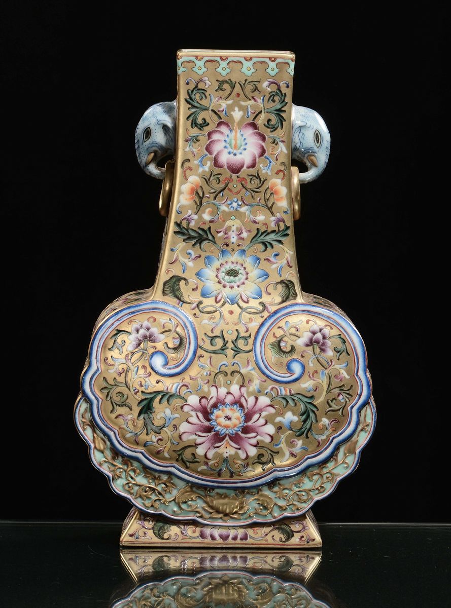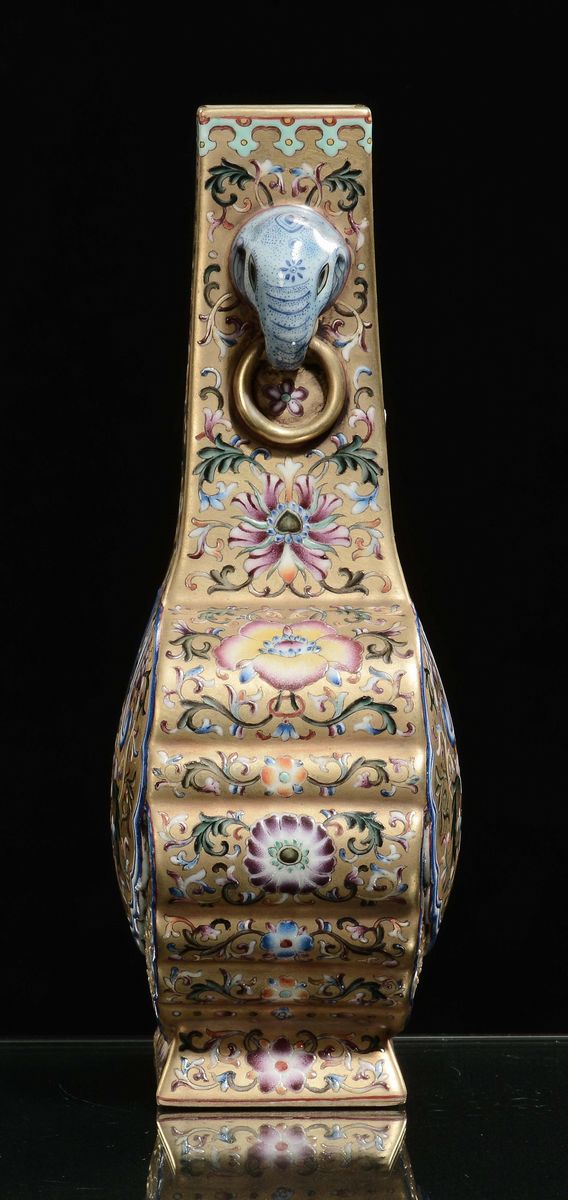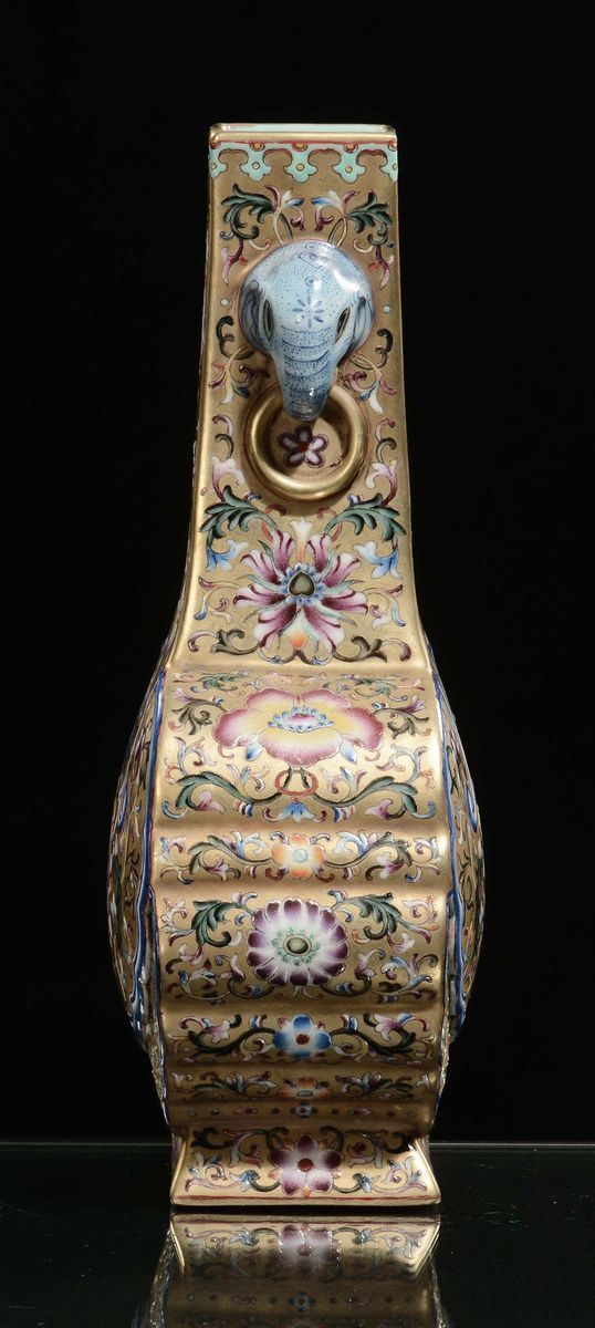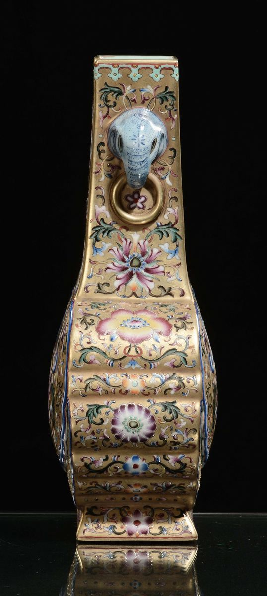Vaso in porcellana dorata a doppia ansa con decoro floreale, Cina, Dinastia Qing, XIX secolo
