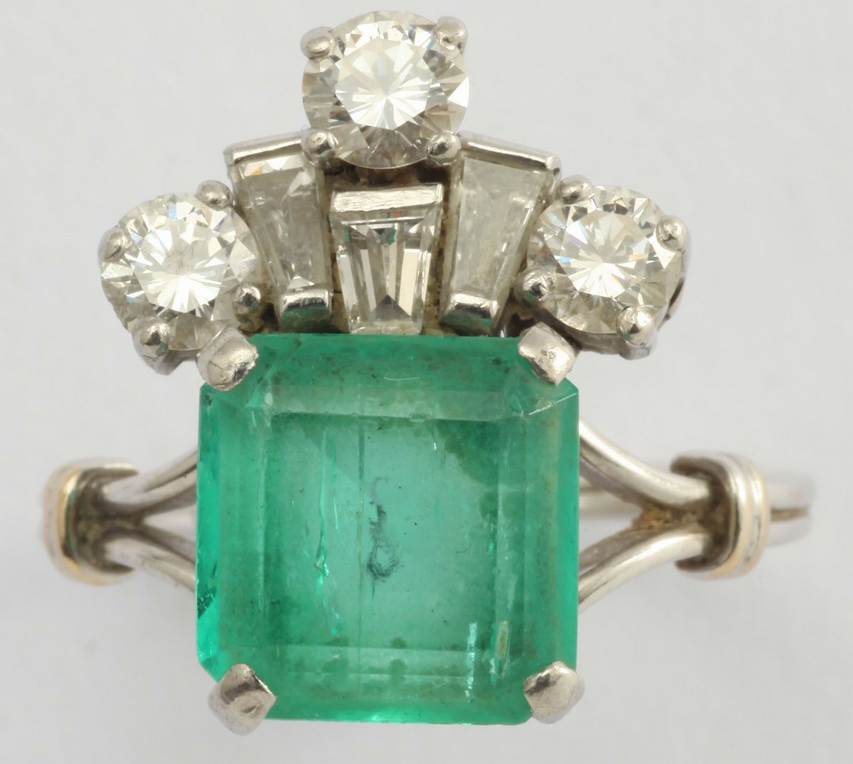 Anello con smeraldo e diamanti taglio rotondo e trapezoidali