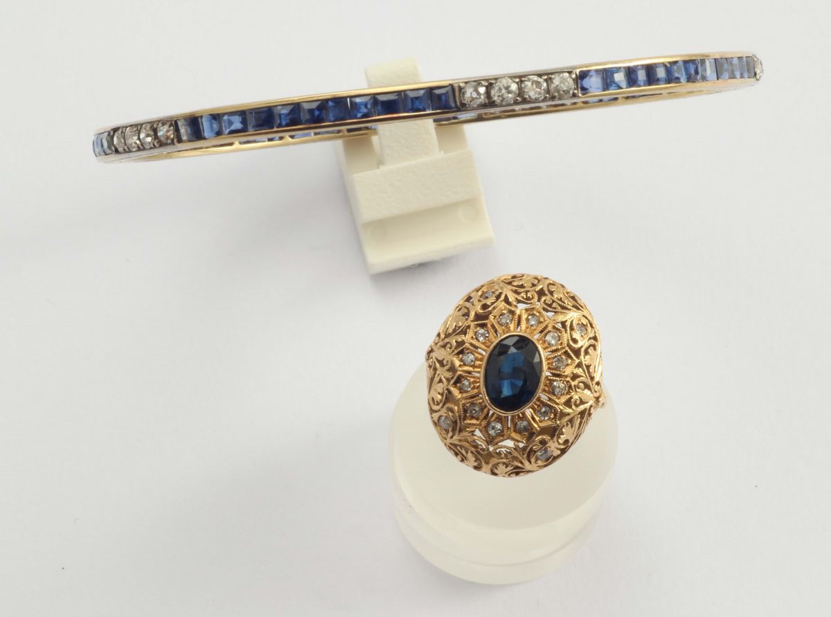 montati in oro giallo 750/1000 con diamanti di vecchio taglio e zaffiri