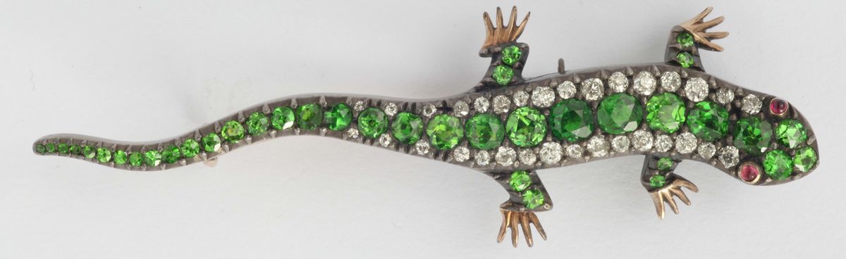 Spilla salamandra con granati demantoidi, diamanti e rubini e diamanti