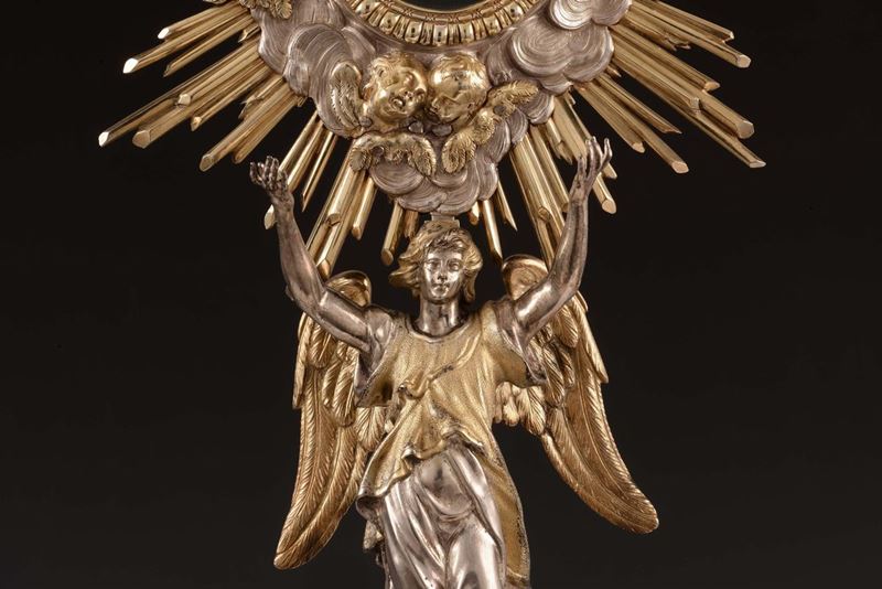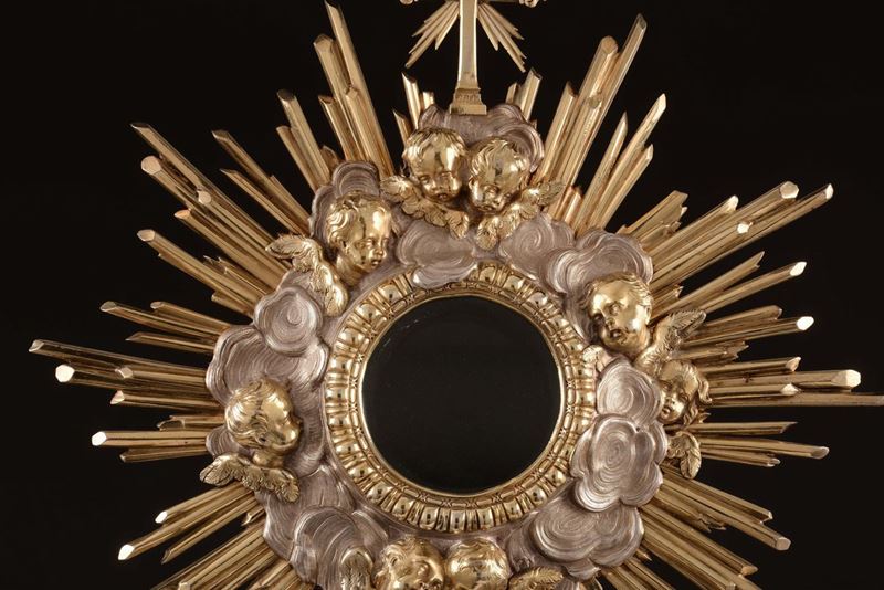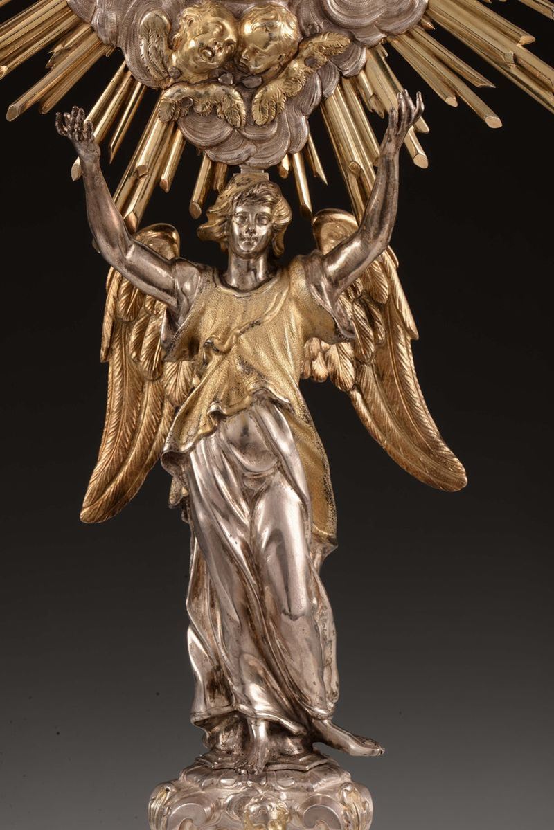 Importante ostensorio riccamente e finemente lavorato con motivi a volute, floreali e teste di cherubini. Nella parte centrale del fusto figura a tuttotondo di angelo alato nell’atto di sorreggere il contenitore dell’eucarestia realizzato a foggia di nube da cui si affacciano testine di angeli e raggi dorati. L’opera, significativa della produzione dell’argenteria romana barocca, eseguita nella bottega dell’importante dinastia di argentieri di origine piemontese Belli attivi a Roma nel XVIII XIX secolo, questa è condotta da Vincenzo I, uno dei più ricercati e celebri maestri argentieri del suo tempo, autore di importanti opere eseguite per illustri committenze religiose e nobiliari anche straniere come testimoniano gli arredi sacri eseguiti per conto di Giovanni V di Portogallo conservati nella chiesa di San Rocco a Lisbona.
